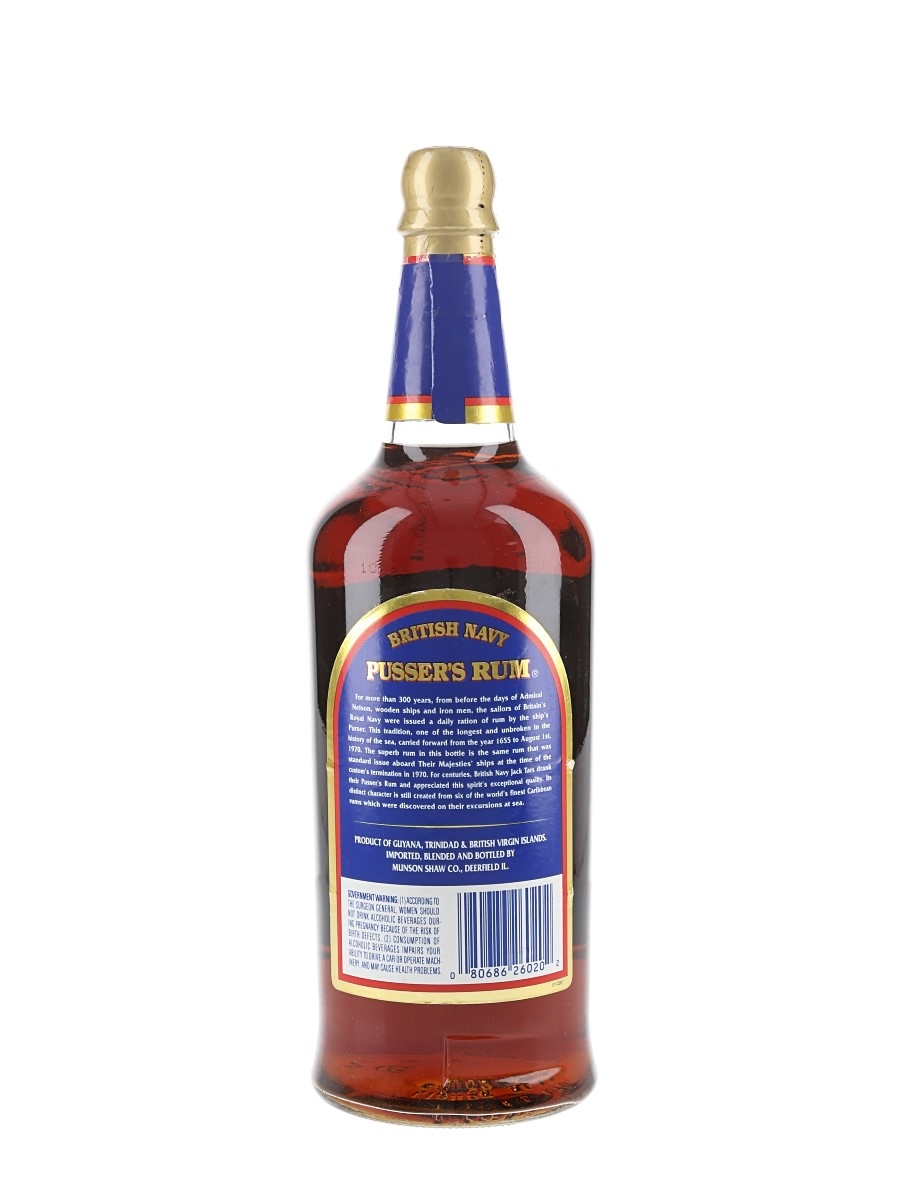 A litre bottle of Pusser's British Navy Rum, produce of Guyana, Trinidad and the British Virgin Islands. This was bottled, blended and imported by Munson Shaw Co., Deerfield, United States, we estimate in the 1990s.