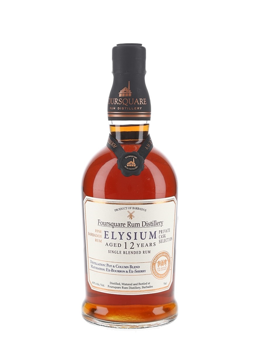 A bottle of Foursquare Elysium 12 Year Old Private Cask Selection Single Blended Fine Barbados Rum. This was matured in a combination of ex-bourbon and ex-Sherry casks and exclusively bottled for The Whisky Exchange.