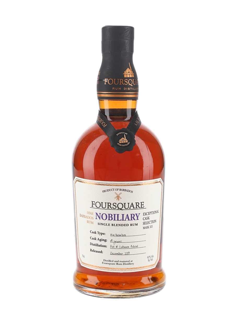 A bottle of Foursquare Nobiliary 14 Year Old Fine Barbados Single Blended Rum. This is a blend of pot still and twin column continuous distillate, matured in a single ex-bourbon cask for 14 years and released in December 2019 at a cask strength of 62% ABV as part of the Exceptional Cask Selection Mark XII series.
