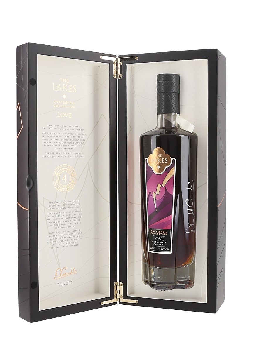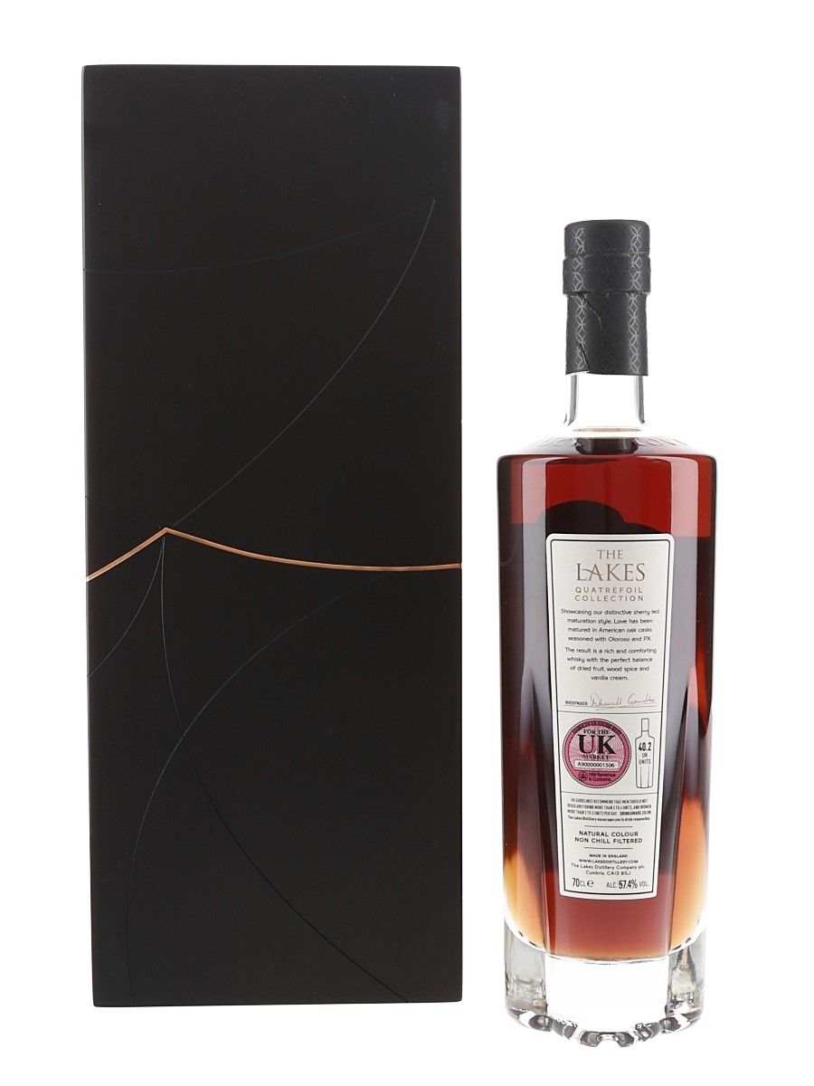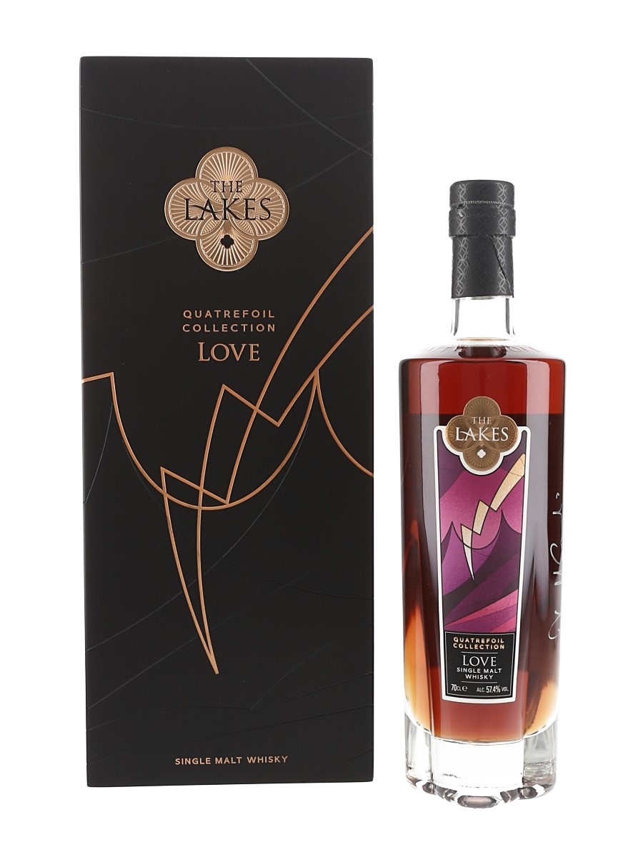 A bottle of The Lakes Quatrefoil Collection Love English Single Malt Whisky, matured in American oak casks seasoned with Oloroso and PX sherry and bottled at 57.4% ABV. This is one of 1000 bottles produced.
