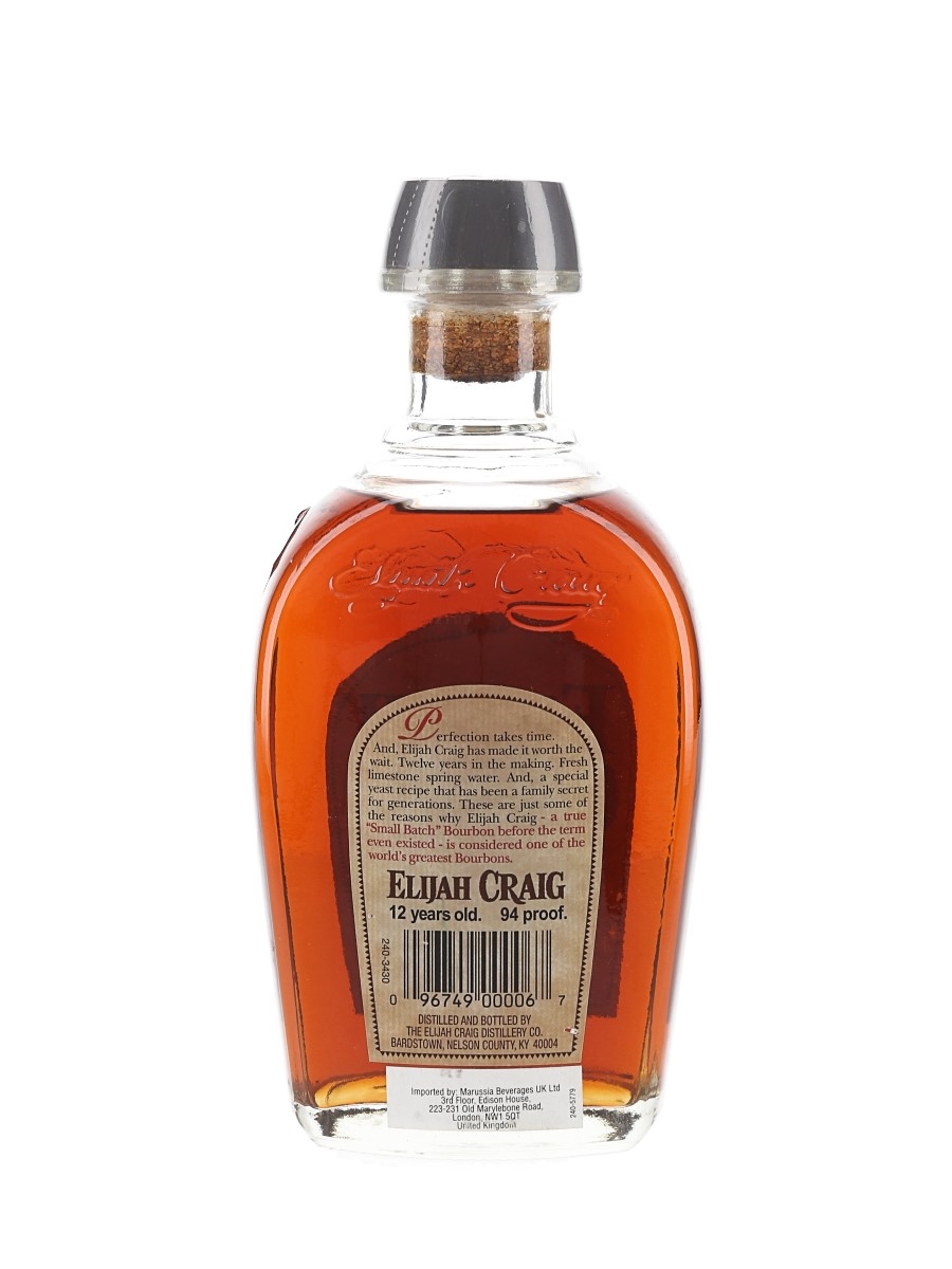 A bottle of Elijah Craig 12 Year Old Kentucky Straight Bourbon Whiskey bottled at 47% ABV.