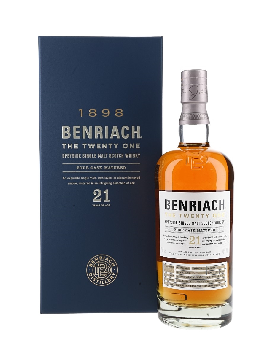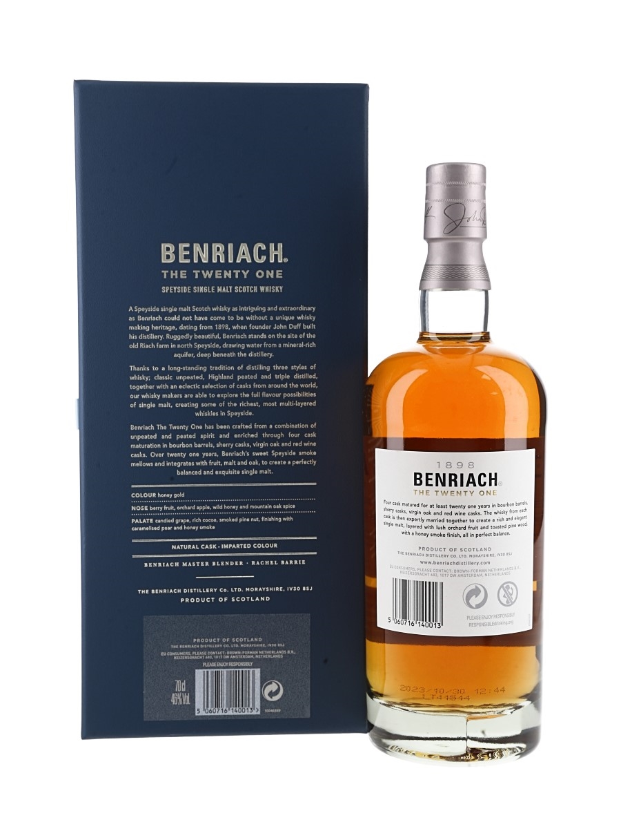 A bottle of Benriach 21 Year Old Single Malt Scotch Whisky. Matured in Bourbon, Virgin Oak, Sherry Oak and Red Wine casks and bottled in 2023.