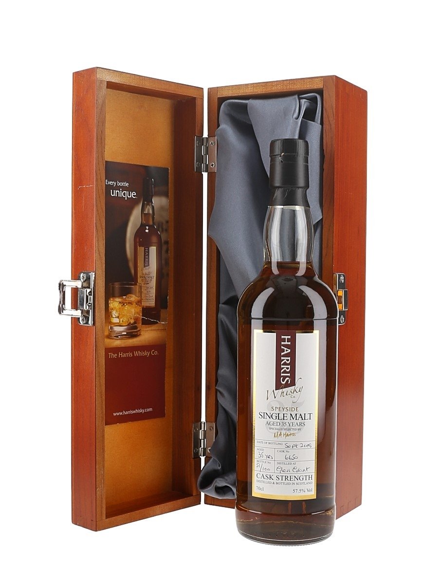 A bottle of Glen Grant 35 Year Old Highland Malt Scotch Whisky, distilled in 1973 and bottled at 57.5% ABV in September 2008 by Harris Whisky. This is bottle number 51 of 100, from cask number 6650.