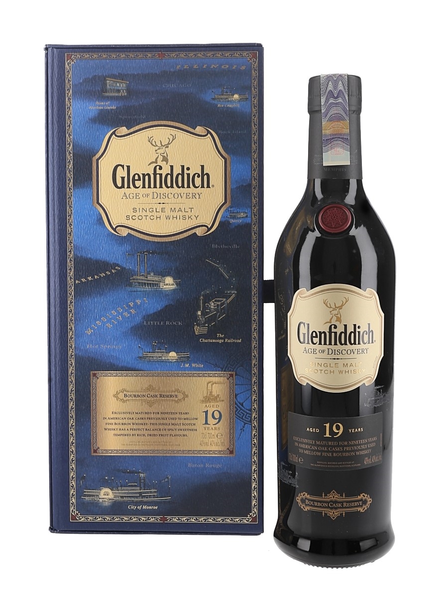 A bottle of Glenfiddich 19 Year Old Single Malt Scotch Whisky. This was matured in American oak casks, previously used to mellow bourbon whiskey. This was released for Glenfiddich’s travel retail Age of Discovery series.
