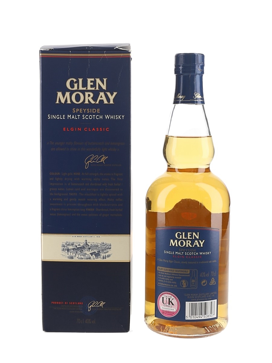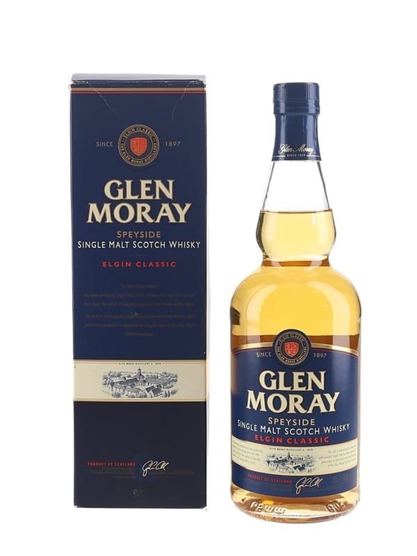 A bottle of Glen Moray Classic Single Speyside Malt Scotch Whisky.