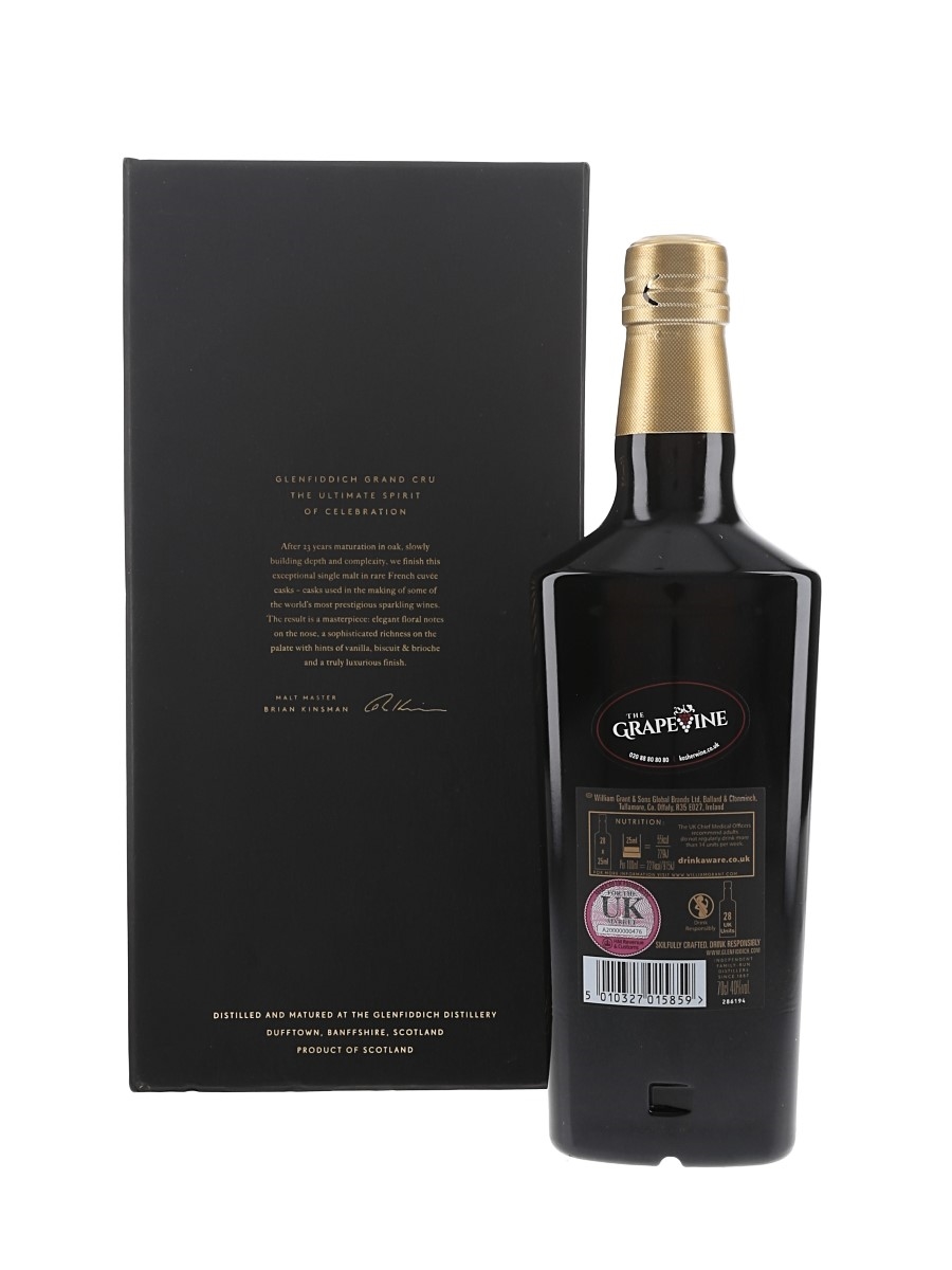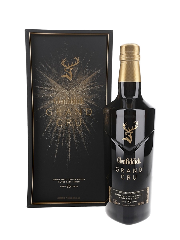 A bottle of Glenfiddich Grand Cru 23 Year Old Single Malt Scotch Whisky, finished in French Cuvée casks previously used in sparkling wine production.
