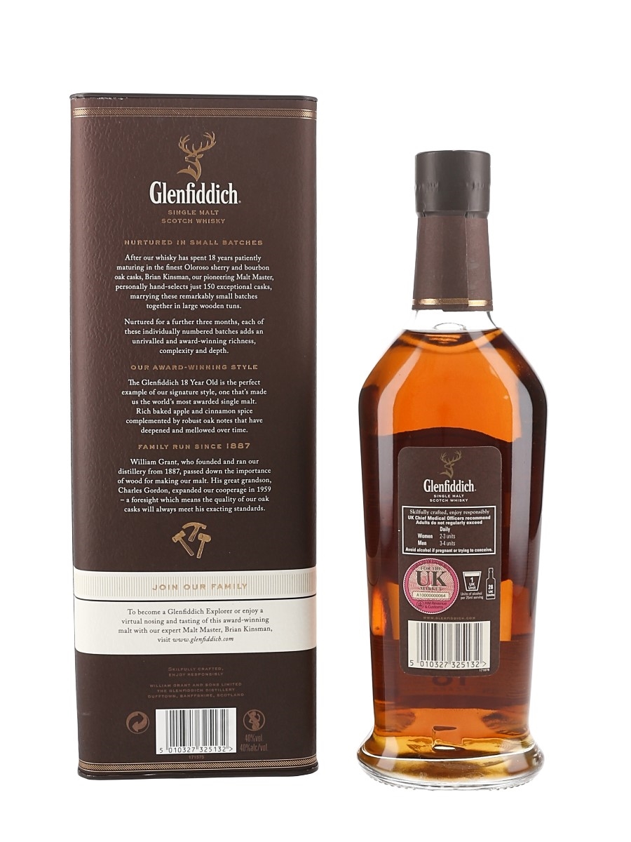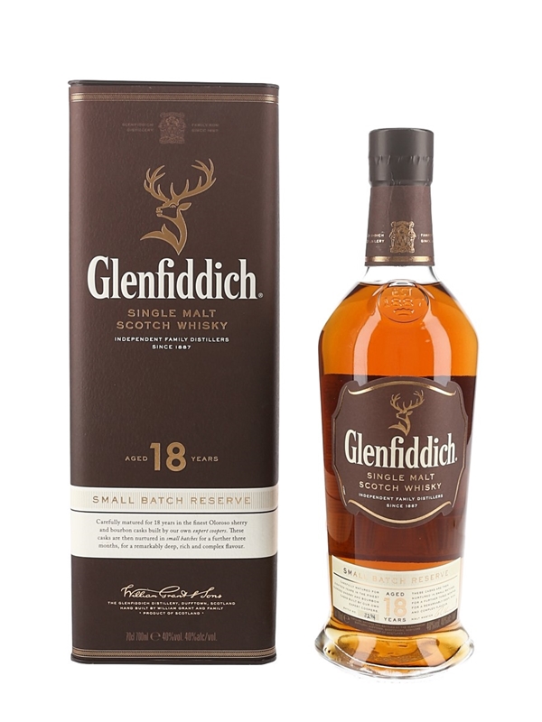 A bottle of Glenfiddich 18 Year Old Small Batch Reserve Single Malt Scotch Whisky.