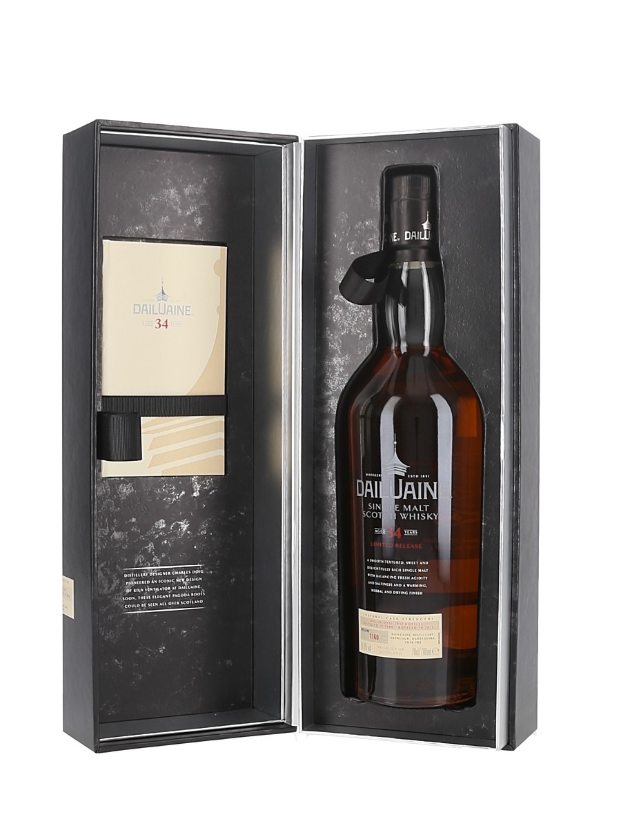 A bottle of Dailuaine 34 Year Old Natural Cask Strength Single Malt Scotch Whisky, distilled in 1980 and bottled at 50.9% ABV in 2015 as part of Diageo's annual Special Releases.