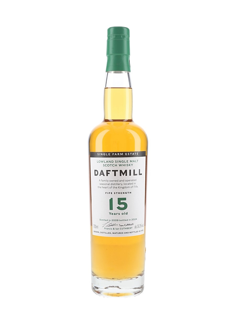 A bottle of Daftmill 15 Year Old Lowland Single Malt Scotch Whisky produced using Optic barley. This was distilled in 2007, matured in ex-bourbon barrels for 15 years and bottled in 2024 at a Traditional Fife strength (Cask Strength) of 56.3% ABV exclusively for The UK Independent Whisky Retailers.