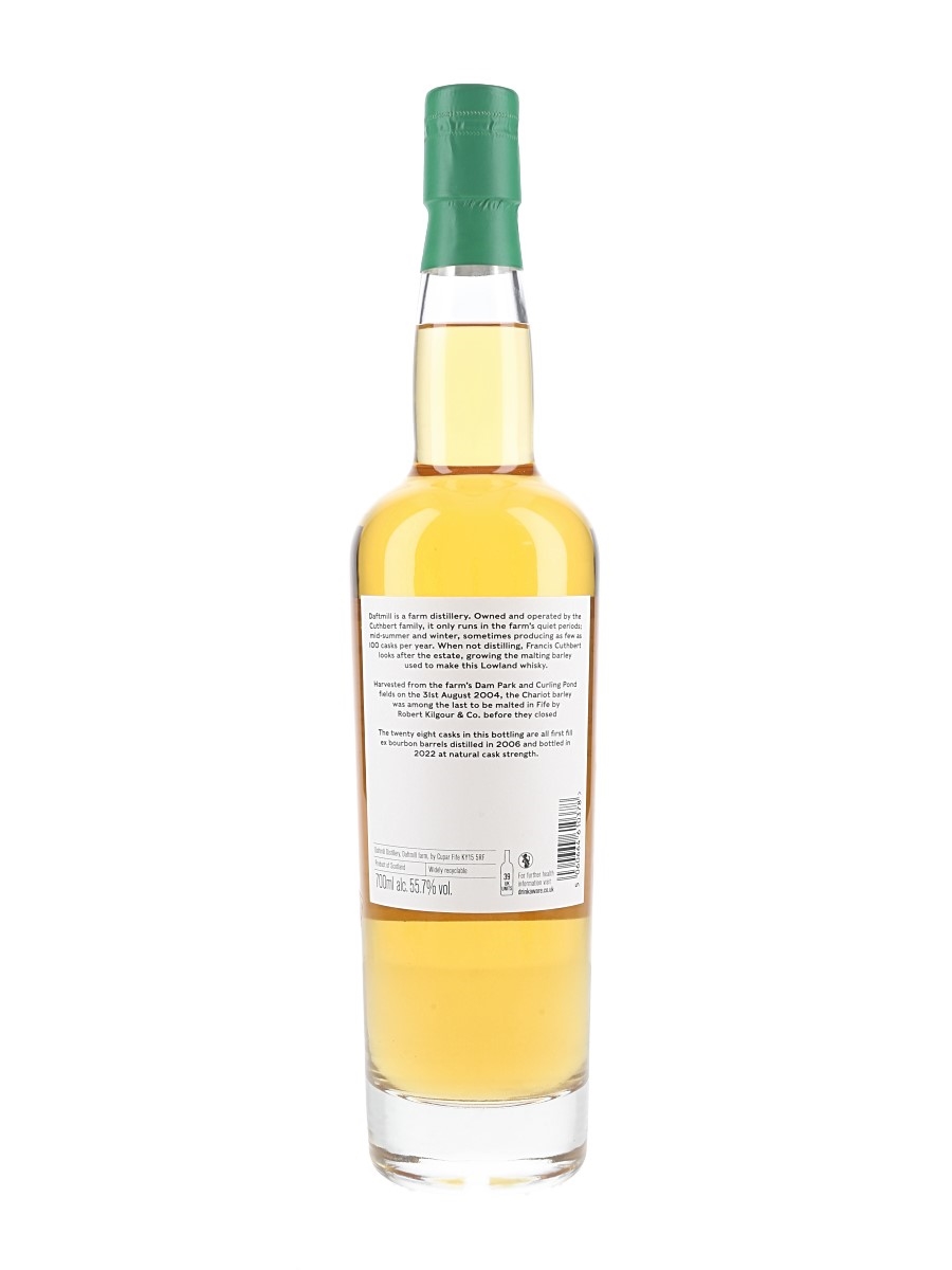 A bottle of Daftmill Lowland Single Malt Scotch Whisky produced using Chariot barley from the farm's Dam Park and Curling Pond fields on 31 August 2004, some of the last barley to be malted in Fife by Robert Kilgour & Co. before their closure in 2005. This was distilled in 2006, matured in ex-bourbon barrels for 15 years and bottled in 2022 at a natural cask strength of 55.7% ABV.