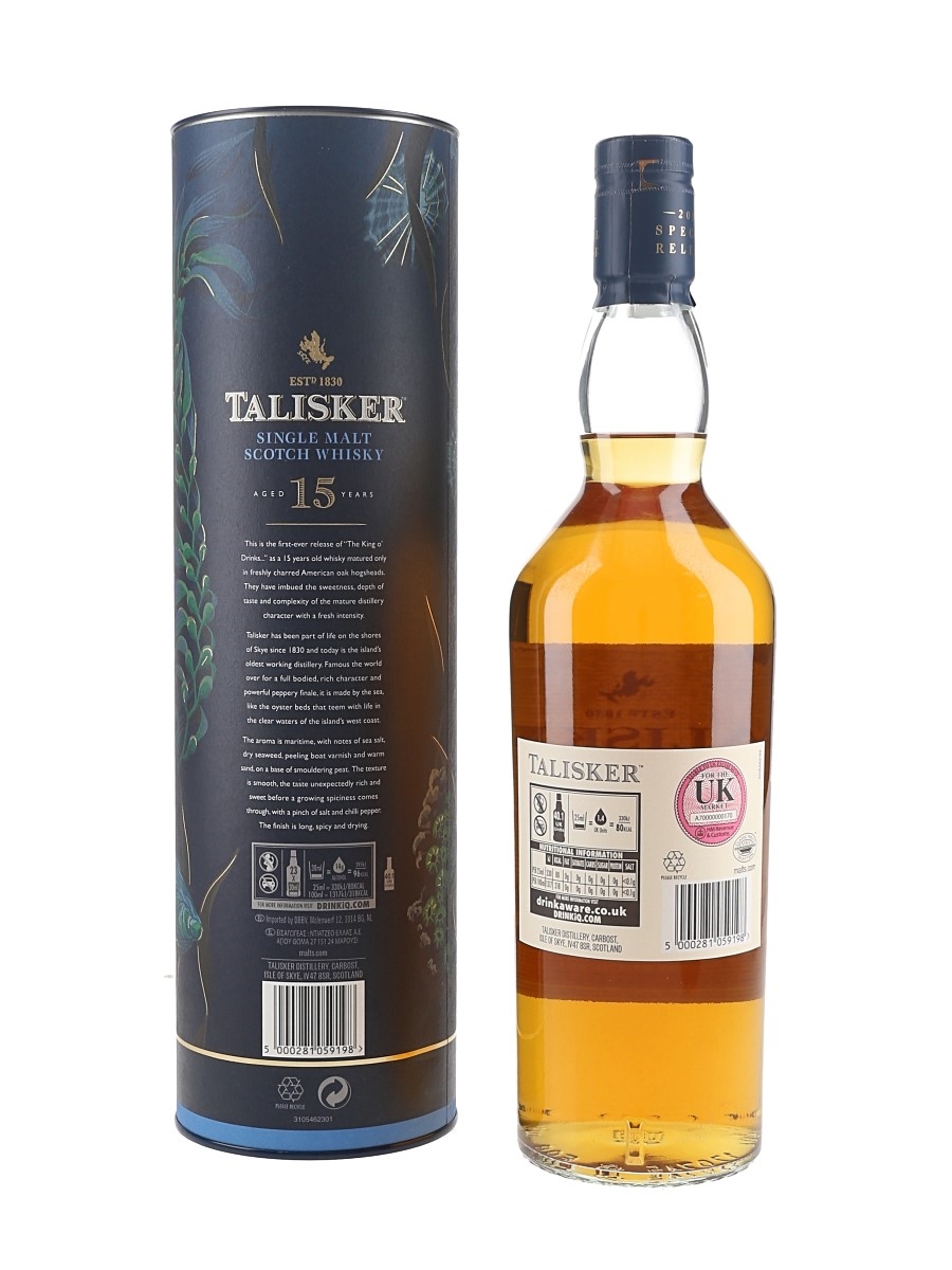 A bottle of Talisker 15 Year Old Single Malt Scotch Whisky, released in 2019 for Diageo's annual Special Releases series. This was matured in freshly charred American oak hogsheads and bottled at a natural cask strength of 57.3% ABV.