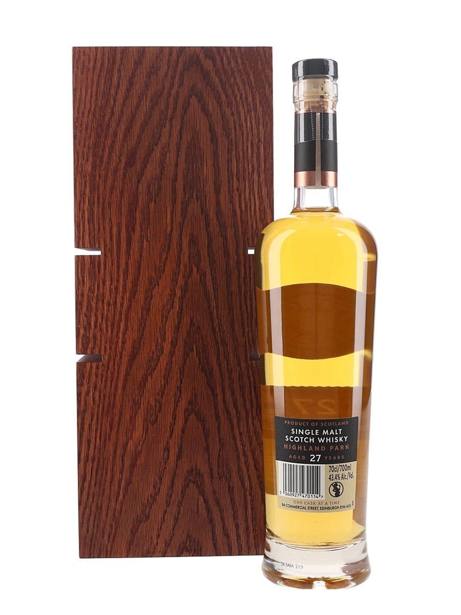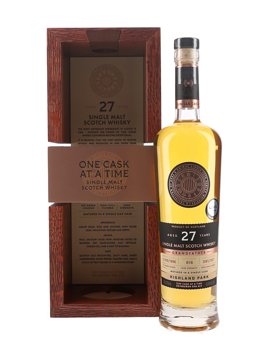 A bottle of Highland Park 27 Year Old Single Malt Scotch Whisky. This was distilled on 13 September 1996, matured for 27 years and bottled at 43.4% ABV by One Cask At A Time as part of the Grandfather range.