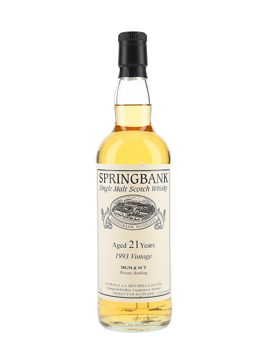 A bottle of Springbank 21 Year Old single malt Scotch whisky. This was distilled in 1993 and bottled at cask strength in 2014 for a private bottling. Please note ABV is not mentioned on the label.