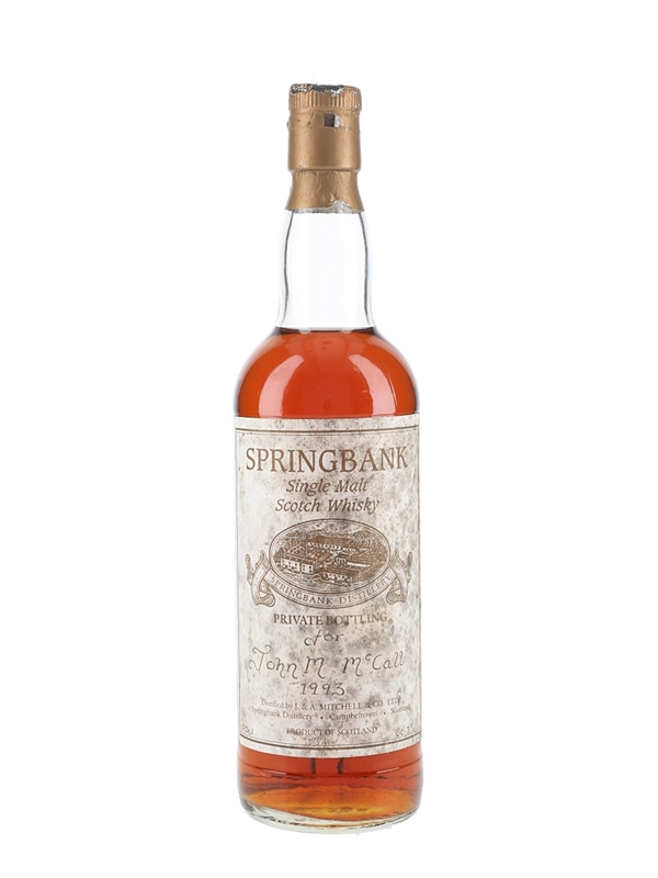 A bottle of Springbank Single Malt Scotch Whisky produced by J. & A. Mitchell & Co. Ltd. This was distilled in 1993 and bottled at 60.3% ABV.