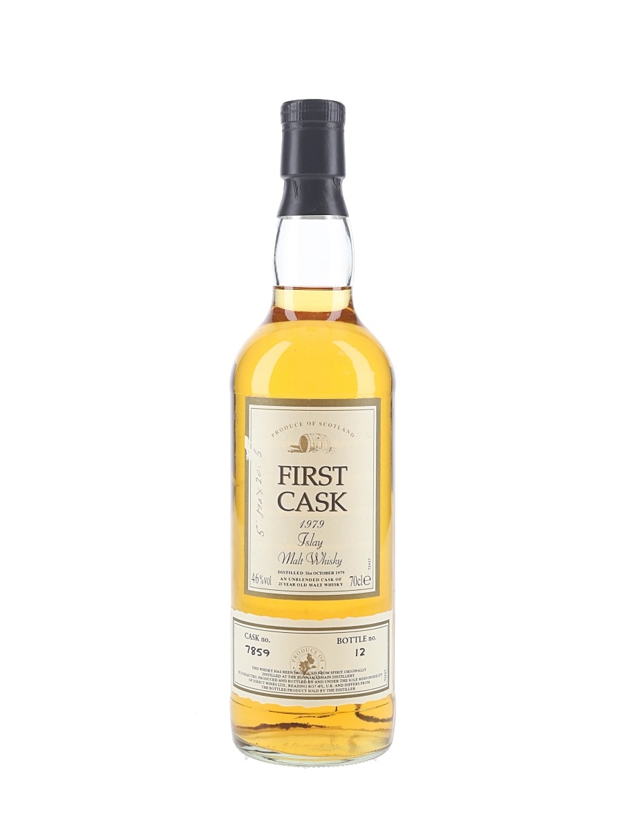 A bottle of Bunnahabhain 25 Year Old Islay Malt Whisky, distilled on 31 October 1979 and bottled from a single cask. This was bottled by Direct Wines for its First Cask series and was available exclusively to First Cask Circle Members.