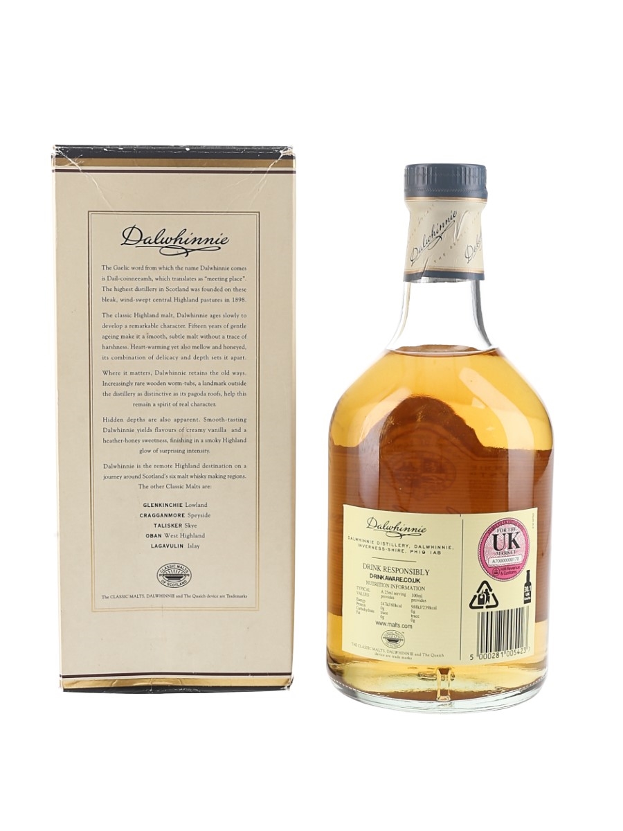 A bottle of Dalwhinnie 15 Year Old Single Highland Malt Scotch Whisky.