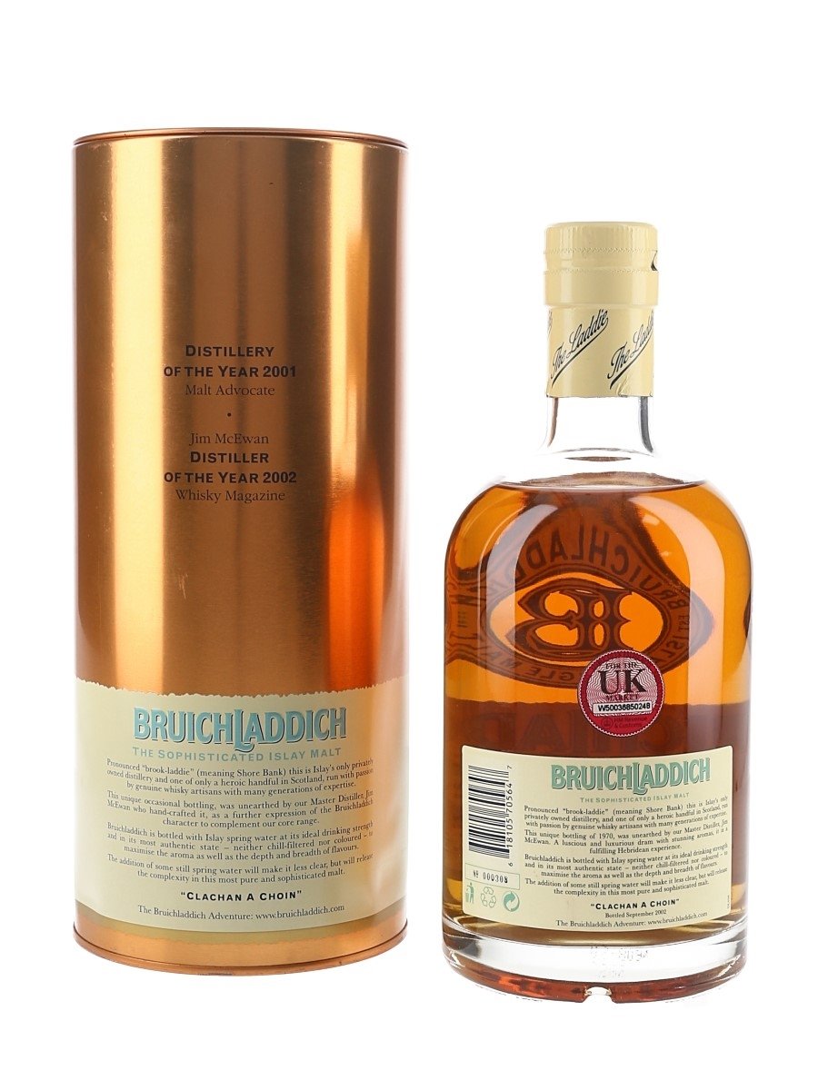 A bottle of Bruichladdich 1970 Islay Single Malt Scotch Whisky. This was distilled in 1970 and bottled in September 2002.