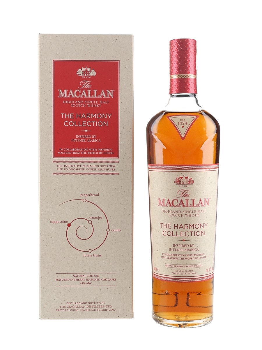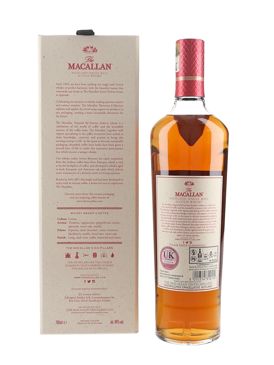 A bottle of The Macallan Intense Arabica Highland Single Malt Scotch Whisky from The Harmony Collection. This is inspired by the Ethiopian Arabica bean, in collaboration with inspiring masters from around the world of coffee.