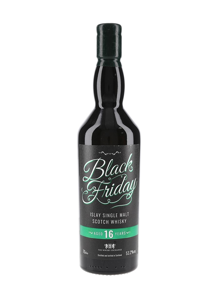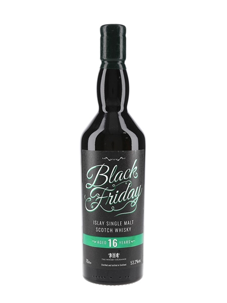 A bottle of Black Friday 16 Year Old Islay Single Malt Scotch Whisky from an Caol Ila distillery. This was bottled by Elixir Distillers for The Whisky Exchange to celebrate Black Friday 2022.