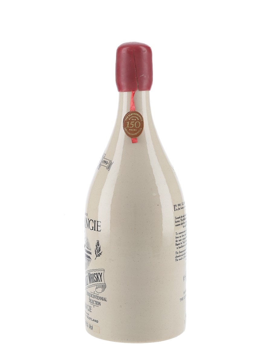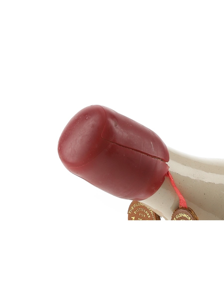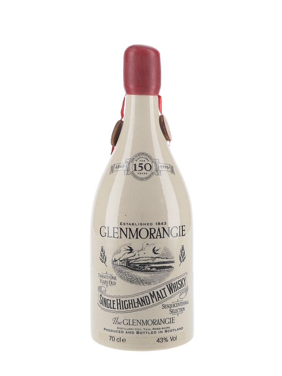 A ceramic bottle of Glemorangie 21 Year Old Sesquicentennial Selection Single Highland Malt Whisky. This was bottled in 1993 to celebrate the 150th anniversary of the founding of the distillery in 1843.