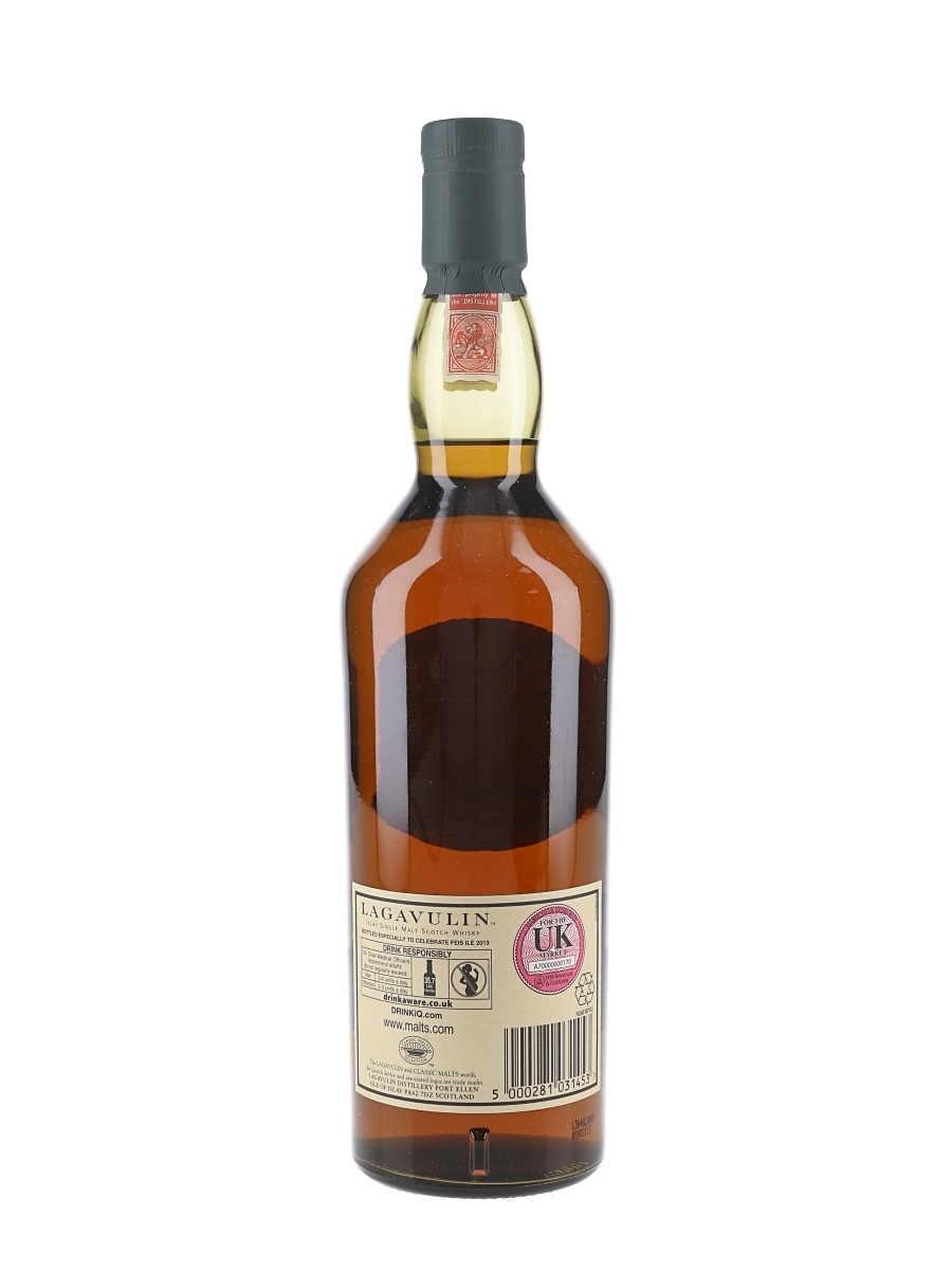 A bottle of Lagavulin Islay Single Malt Scotch Whisky. This was distilled on 8 May 1995, matured in an European oak sherry butt, selected by Iain McArthur and bottled at 51% ABV especially for Feis Ile 2013, the Islay festival of music and malt.