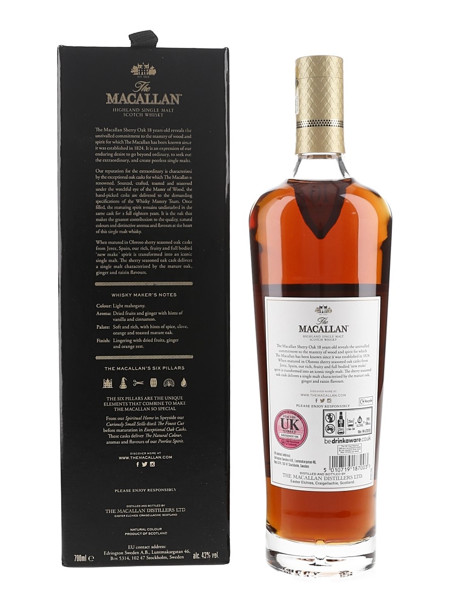 A bottle of The Macallan 18 Year Old Highland Single Malt Scotch Whisky. This was matured exclusively in hand-picked sherry seasoned oak casks from Jerez, Spain, and bottled at 43% ABV for the annual release in 2022.