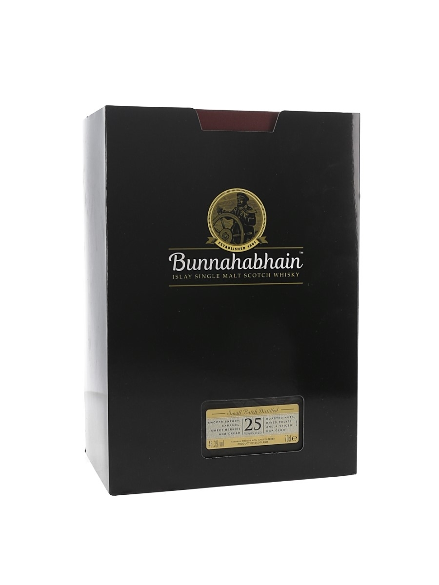 A bottle of Bunnahabhain 25 Year Old Small Batch Distilled Islay Single Malt Scotch Whisky bottled at 46.3% ABV.