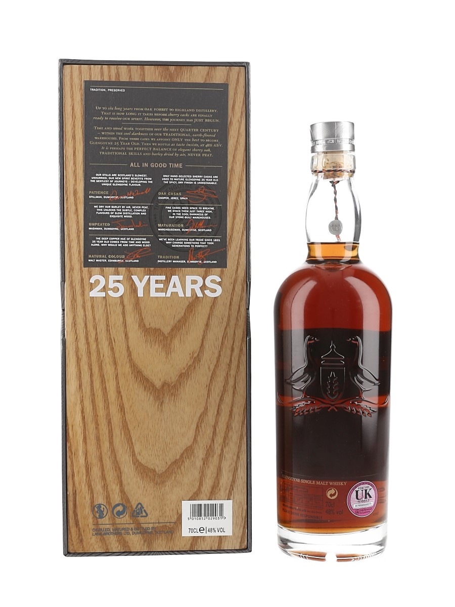 A bottle of Glengoyne 25 Year Old Highland Single Malt Scotch Whisky. This bottling was produced in the distillery's traditional style: slow distillation, no peat used, and matured in sherry casks. The bottling code indicates this was bottled in 2018.