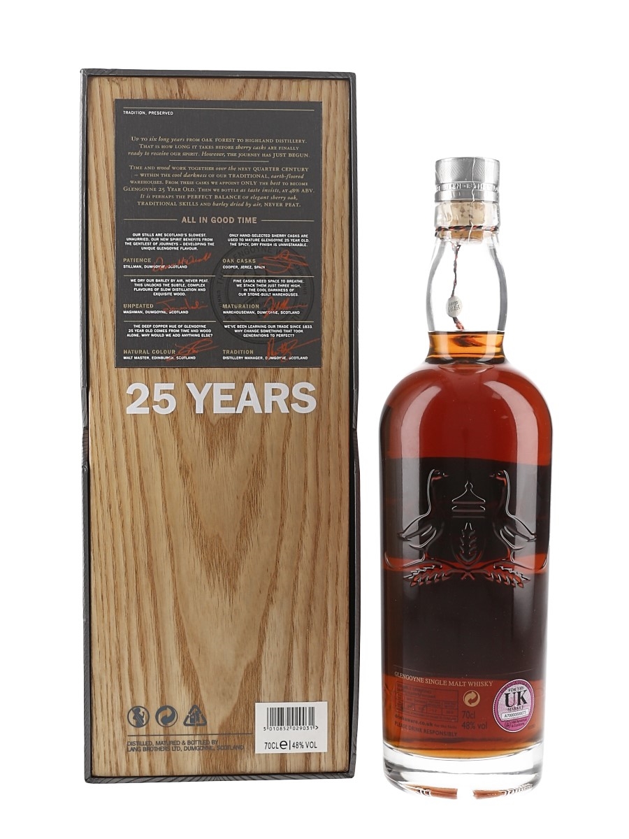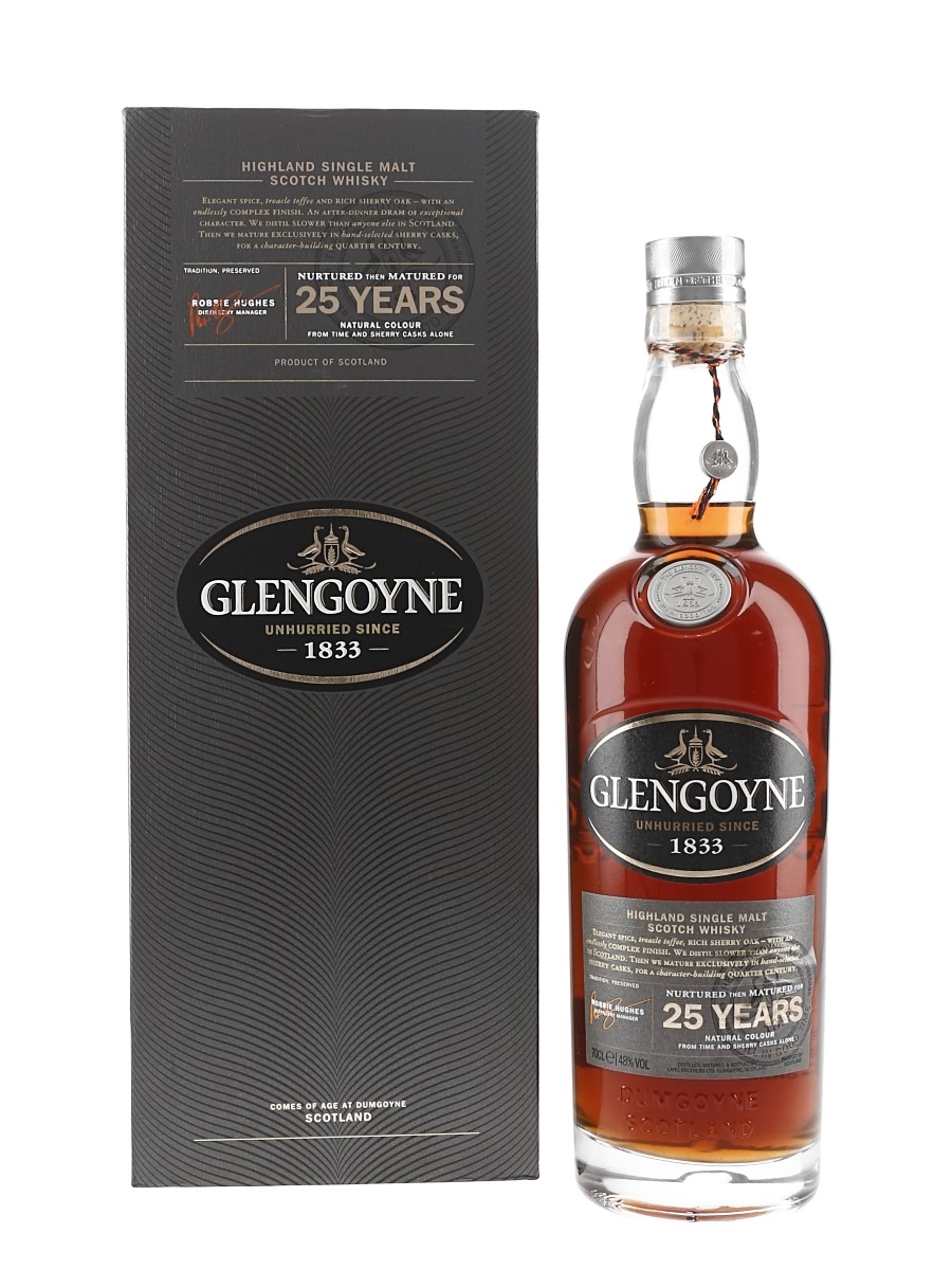 A bottle of Glengoyne 25 Year Old Highland Single Malt Scotch Whisky. This bottling was produced in the distillery's traditional style: slow distillation, no peat used, and matured in sherry casks.
