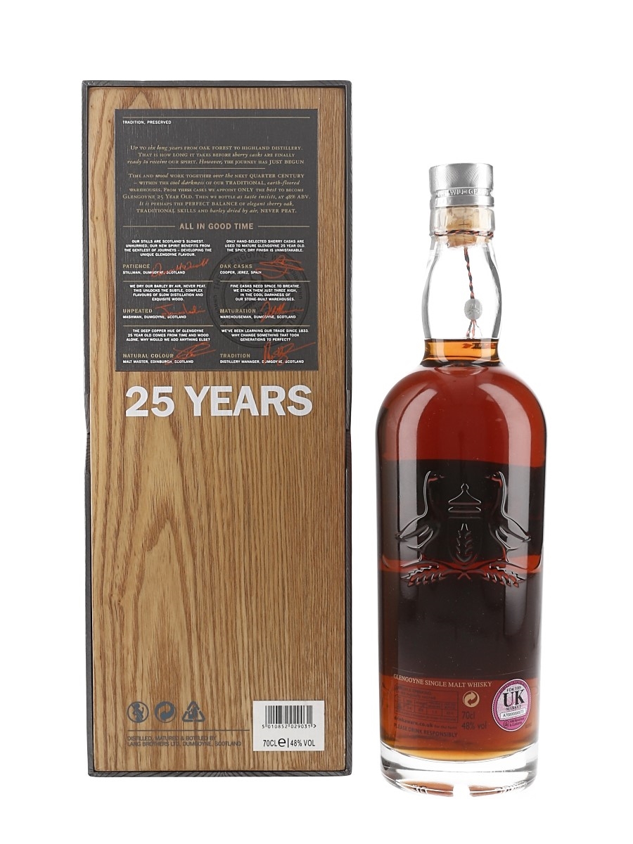 A bottle of Glengoyne 25 Year Old Highland Single Malt Scotch Whisky. This bottling was produced in the distillery's traditional style: slow distillation, no peat used, and matured in sherry casks.