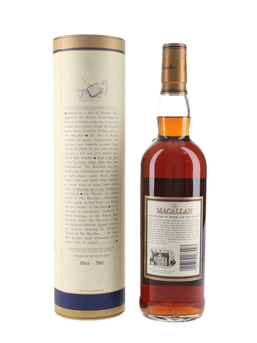 A bottle of The Macallan 18 Year Old Single Highland Malt Scotch Whisky. This was distilled in 1982 and matured in sherry casks from Jerez, Spain.