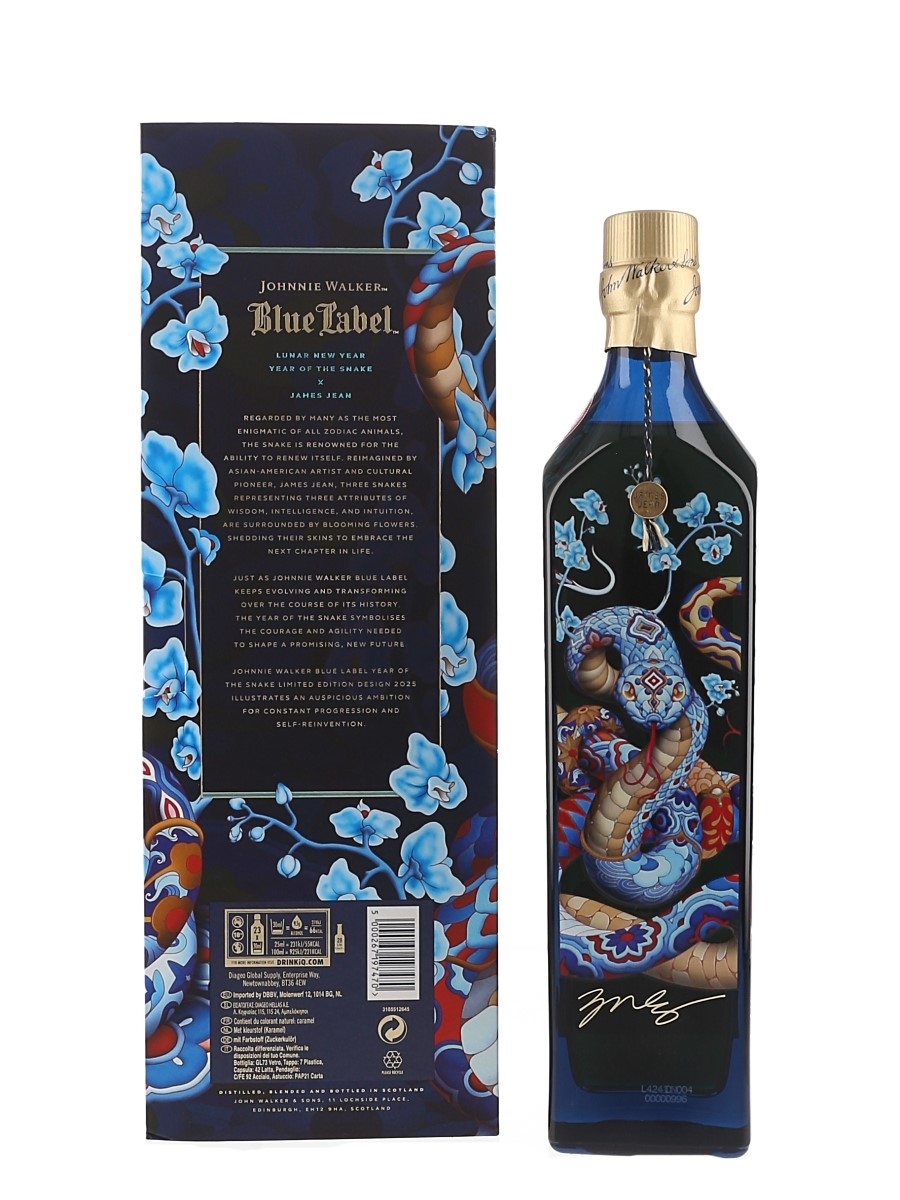 A bottle of Johnnie Walker Blue Label Year Of The Snake 2025 with a Limited Edition Design by James Jean. This is bottle number 004590. This was signed by Emma Walker.