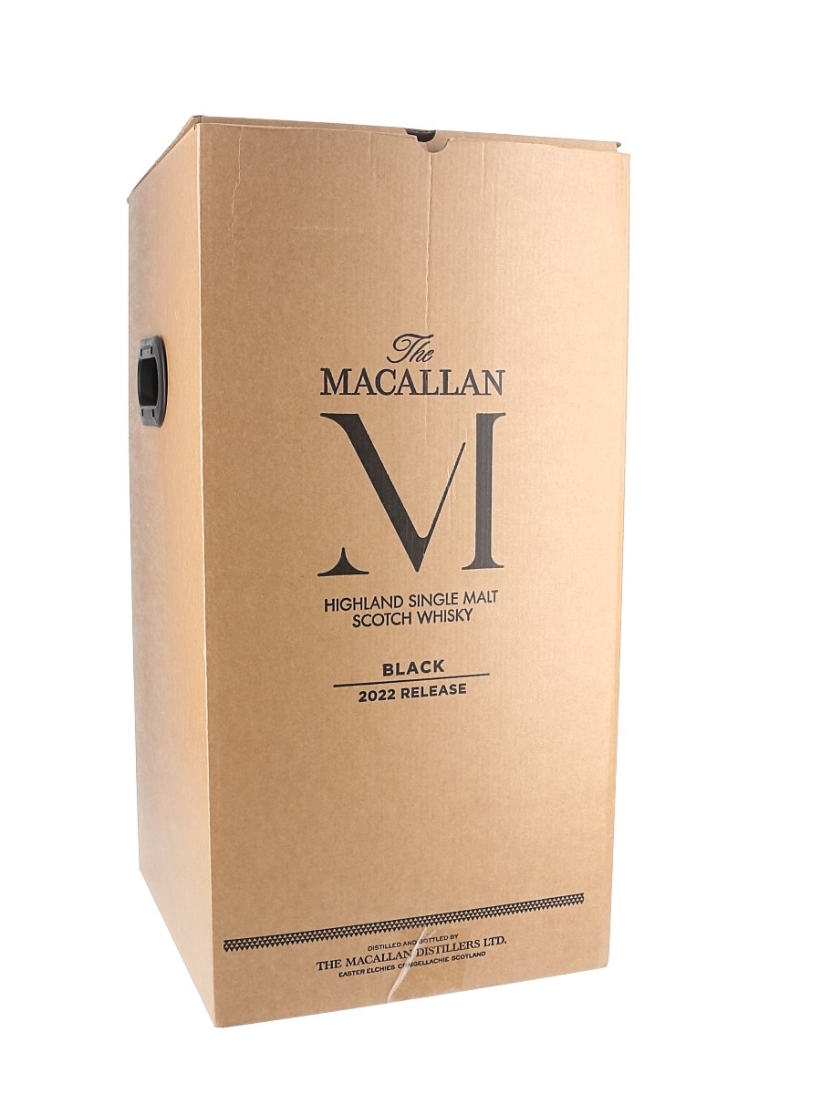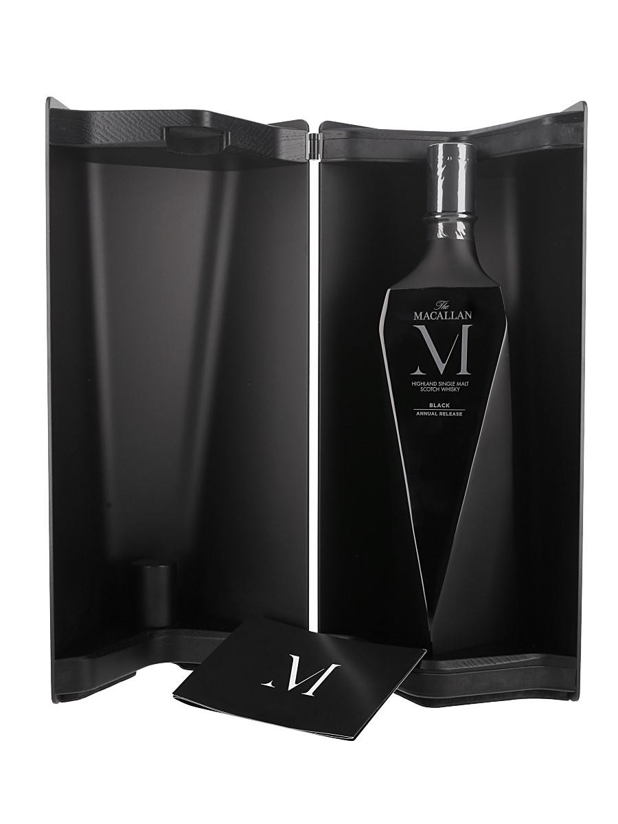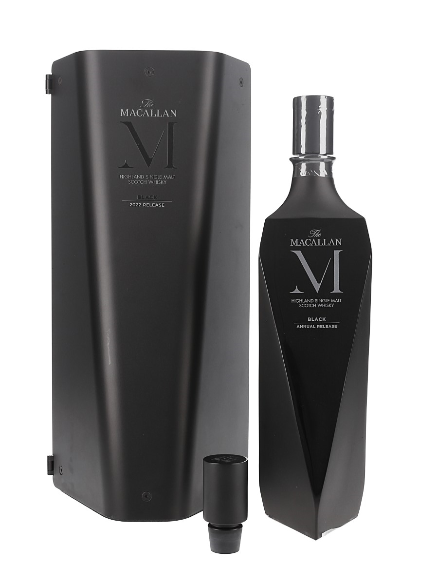 The 2022 release of The Macallan M Black Highland Single Malt Scotch Whisky, presented in a black Lalique crystal decanter and a mirrored presentation box. This edition in the Master Decanter Series is a collaboration between The Macallan distillery, designer Fabien Baron and renowned French glassmaker Lalique.