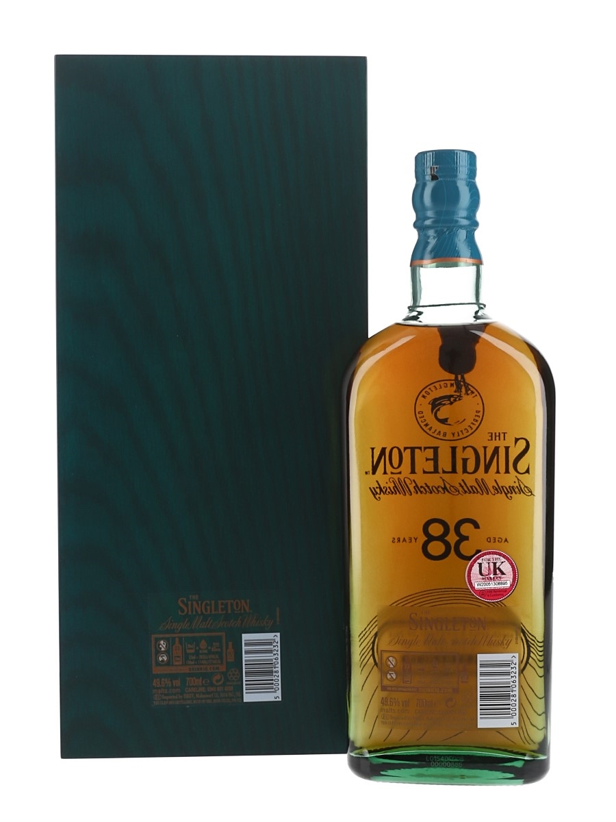 A bottle of Singleton of Glen Ord 38 Year Old Single Malt Scotch Whisky, the only Highland malt in the Singleton range. This was distilled in 1981, matured for 12 years and transferred to bourbon and Bodega casks for further 26 years before bottling in 2019.