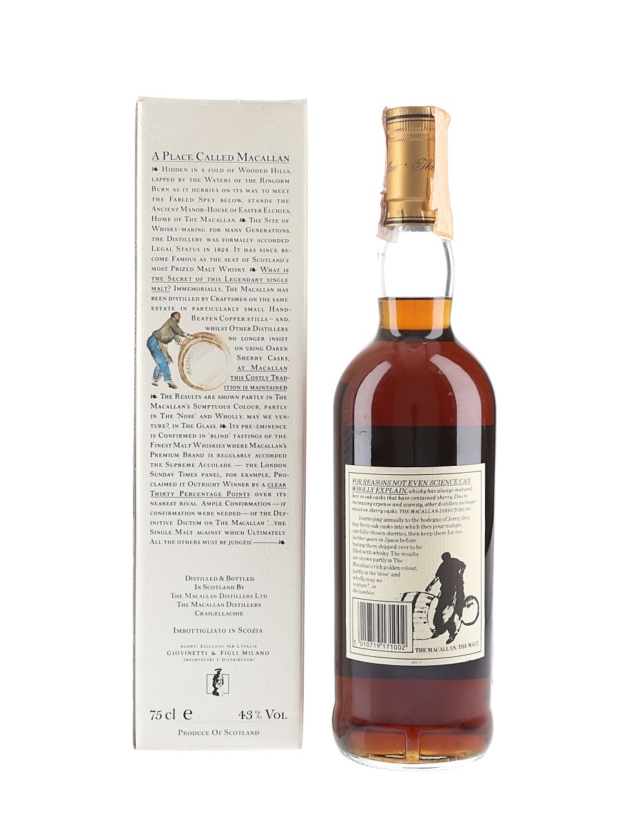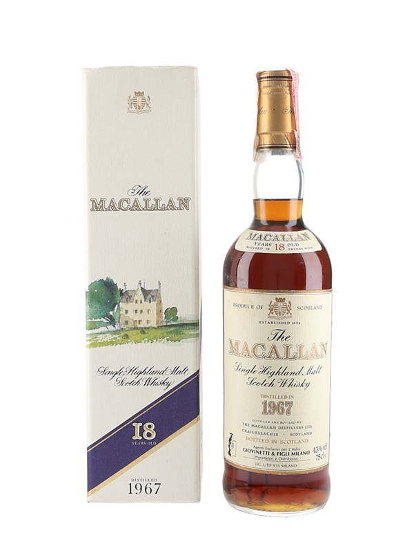 A bottle of The Macallan 18 Year Old Single Highland Malt Scotch Whisky. This was distilled in 1967, matured in sherry casks and bottled in the 1980s. This was imported to Italy by Giovinetti & Figli.