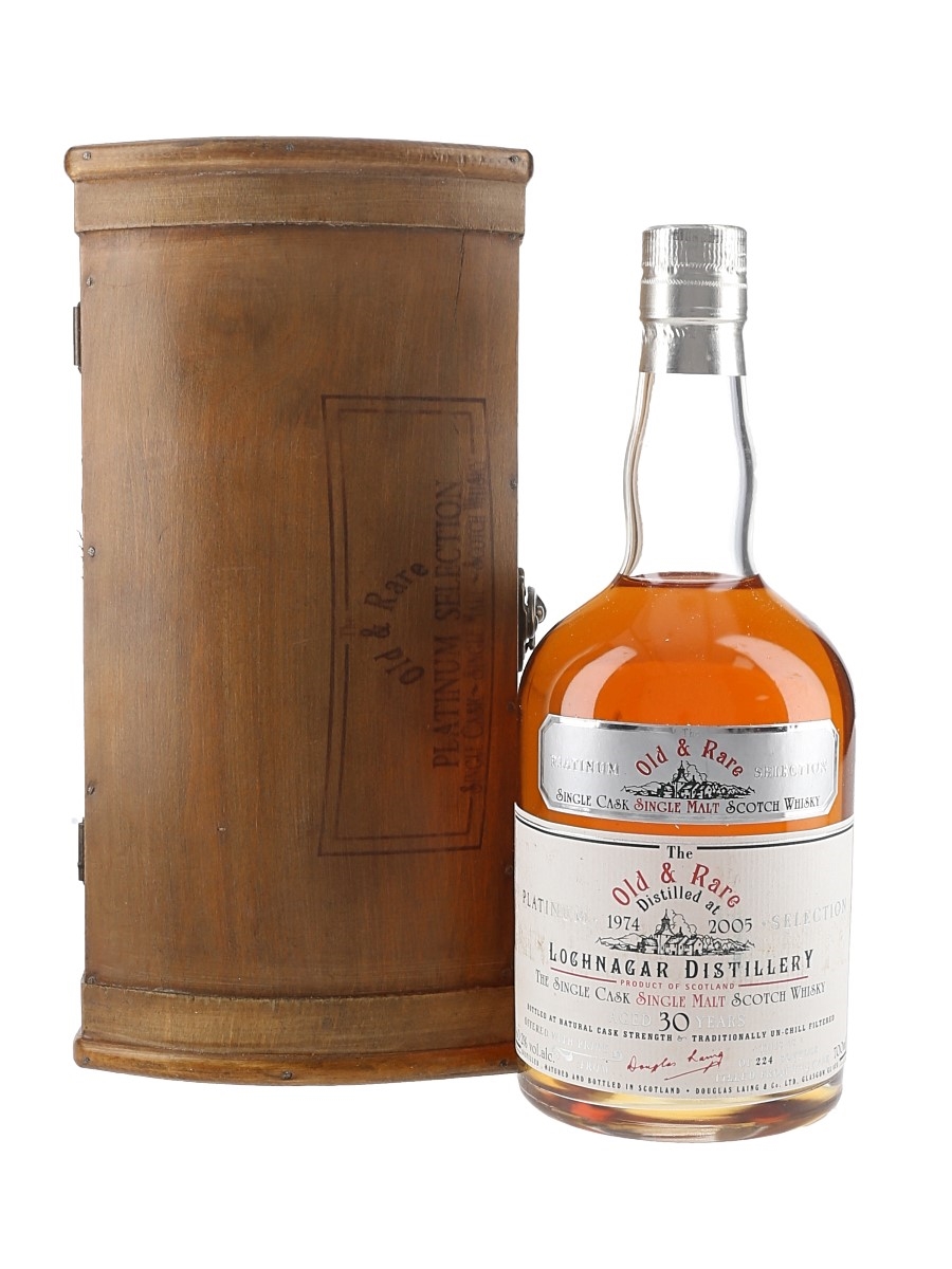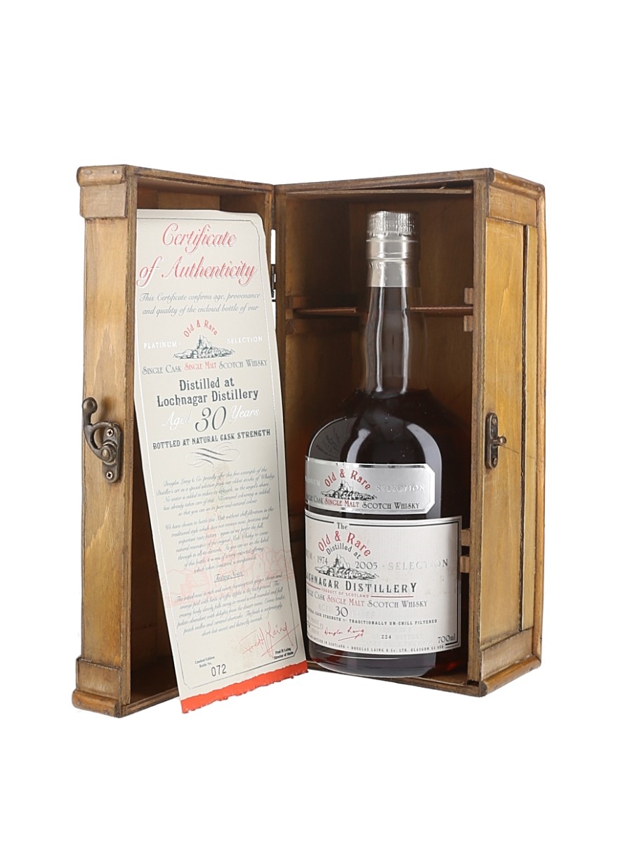 A bottle of Lochnagar 30 Year Old Single Malt Scotch Whisky. This was distilled in 1974, matured in a single cask and bottled in 2005 for Douglas Laing's Old & Rare Platinum Selection series.