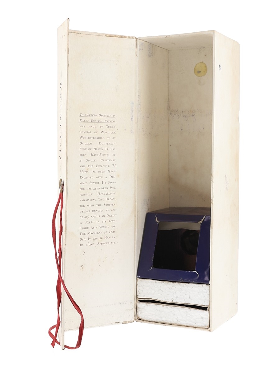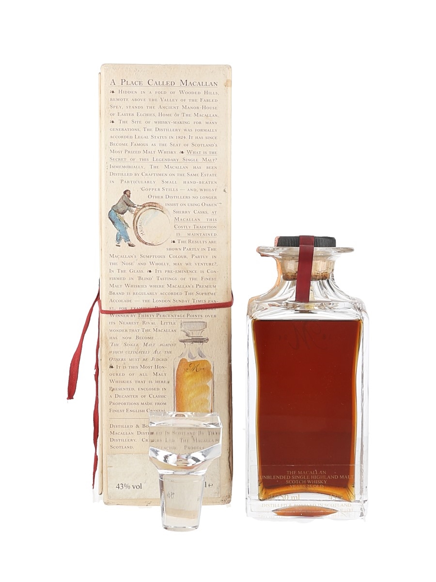 A bottle of The Macallan 25 Year Old Single Highland Malt Scotch Whisky. This was distilled in 1962, bottled in 1987 and imported to Italy by Giovinetti. This whisky is presented in a square crystal decanter with stopper made by Tudor Crystal. The decanter was hand-blown by a single craftsman and the letter M was hand-engraved with a diamond stylus.