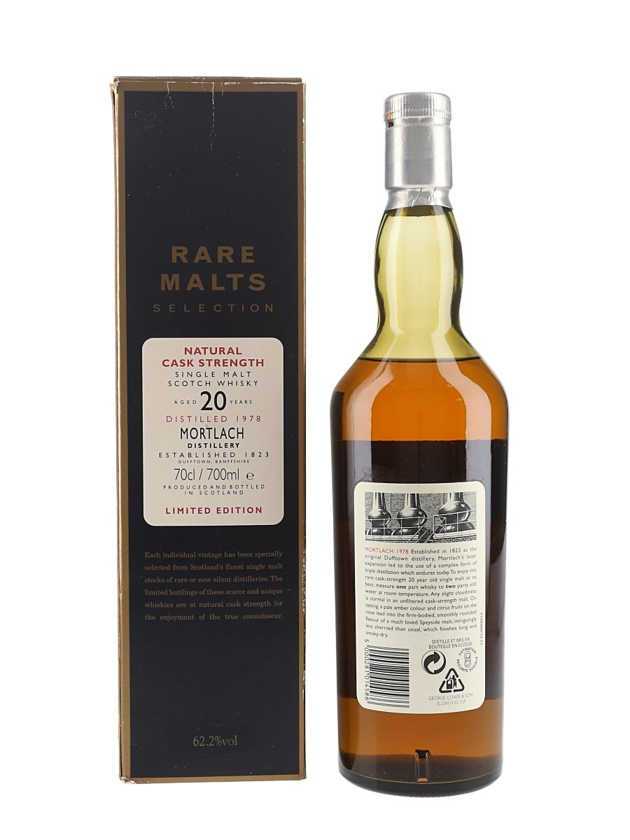 A bottle of Mortlach 20 Year Old Single Malt Scotch Whisky. This was distilled in 1978 and bottled at a natural cask strength of 62.2% ABV in May 1998 for Diageo's now discontinued Rare Malts Selection range.