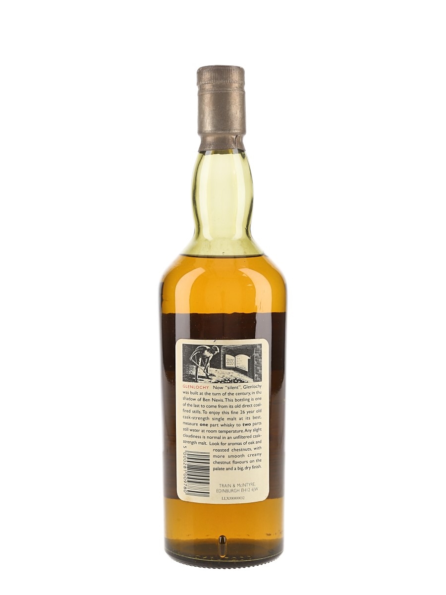A bottle of Glenlochy 26 Year Old Single Malt Scotch Whisky. This was distilled in 1969 and bottled at a natural cask strength of 58.8% for Diageo's now-discontinued Rare Malts Selection. The Rare Malts were a series of cask strength whiskies first released in 1995 by DCL (later to become part of Diageo).