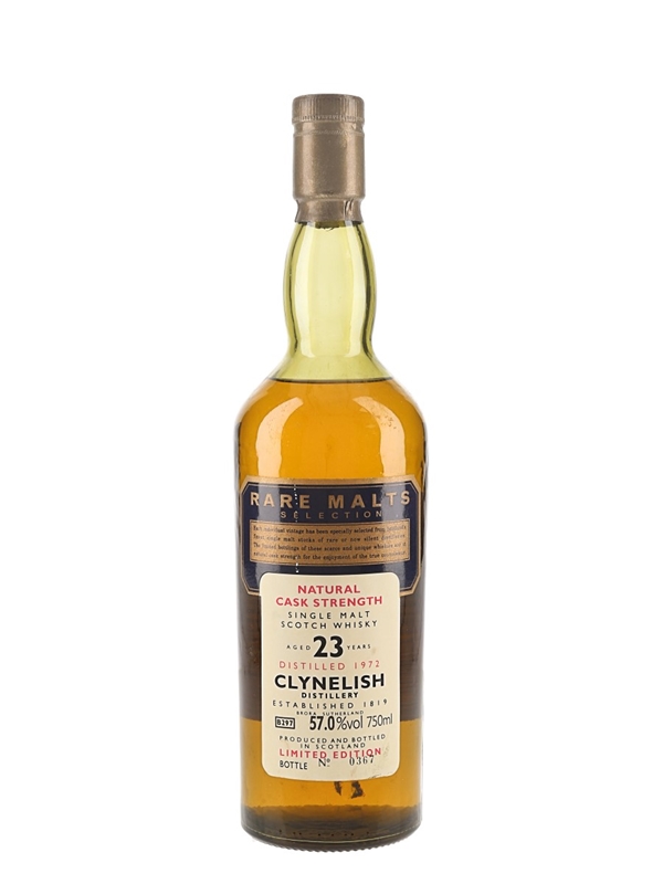 A bottle of Clynelish 23 Year Old Single Malt Scotch Whisky. This was distilled in 1972 and bottled at a natural cask strength of 57% ABV for Diageo's now-discontinued Rare Malts Selection. This was bottled for the South African market.