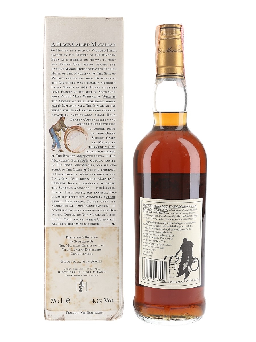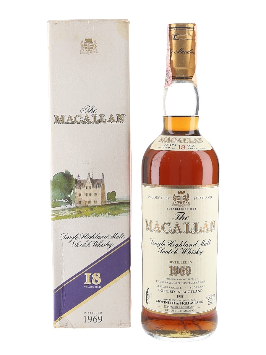 A bottle of The Macallan 18 Year Old Single Highland Malt Scotch Whisky. This was distilled in 1969, matured in sherry casks and bottled in 1988. This was imported to the Italian market by Giovinetti & Figli.