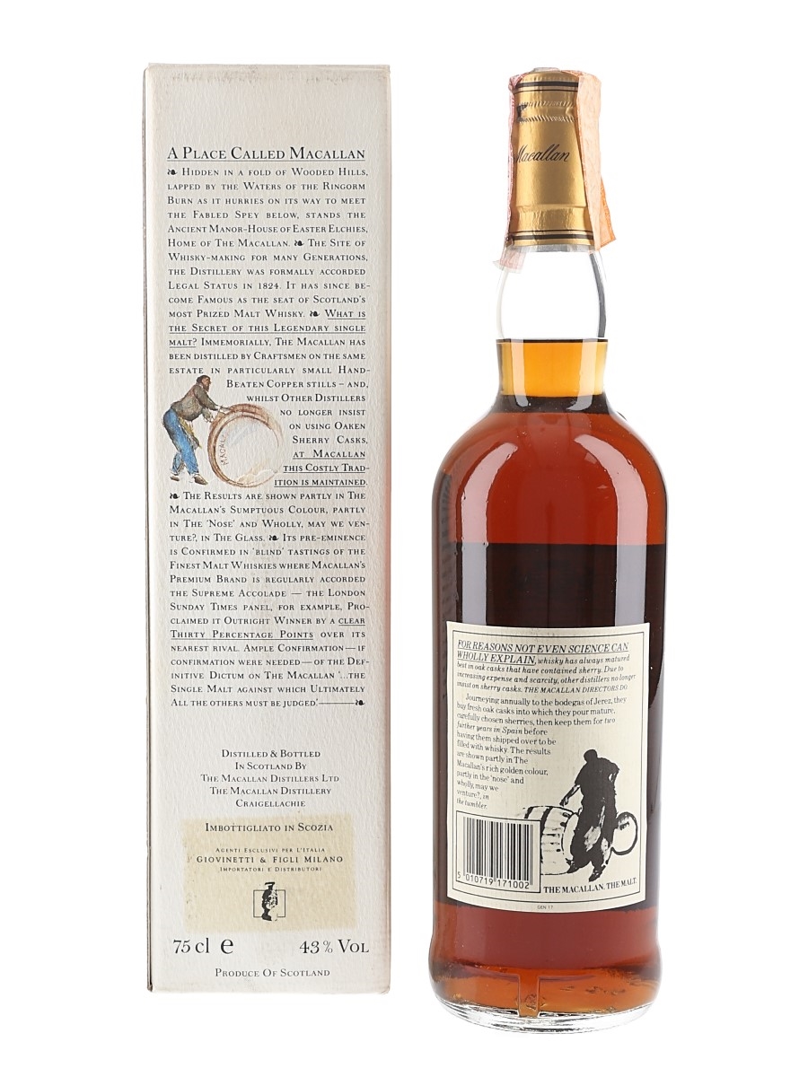 A bottle of The Macallan 18 Year Old Single Highland Malt Scotch Whisky. This was distilled in 1968, matured in sherry casks and bottled in 1988. This was imported to the Italian market by Giovinetti & Figil.