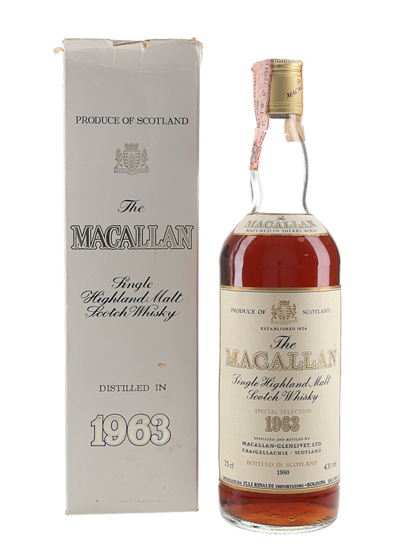 A bottle of The Macallan 1963 Special Selection Single Highland Malt Scotch Whisky, bottled for Italian importer Rinaldi in 1980.