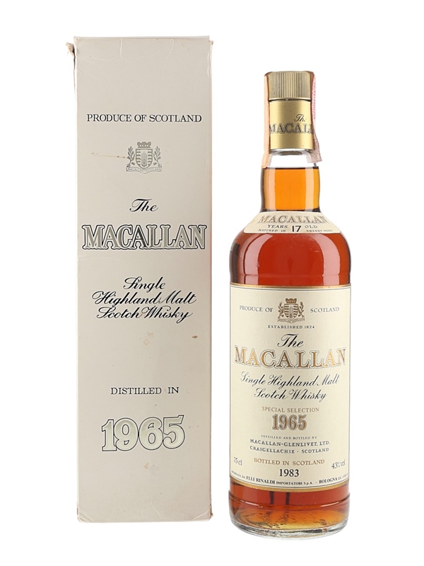 A bottle of The Macallan 17 Year Old Single Highland Malt Scotch Whisky. This was distilled in 1965, matured in sherry casks and bottled in 1983 at 43% ABV. This was imported to the Italian market by Rinaldi.