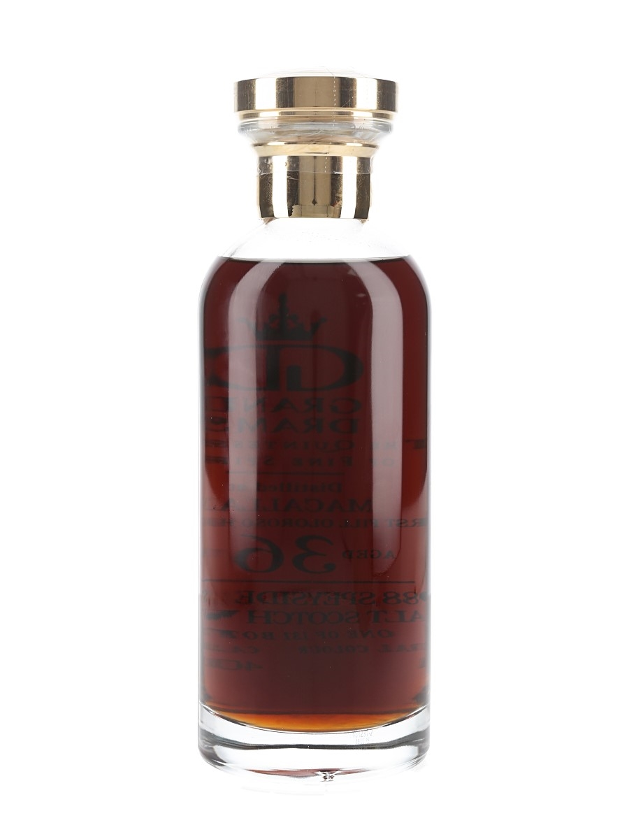 A bottle of Macallan 36 year old Speyside single malt whisky, distilled in 1988 and matured in a first fill oloroso hogshead before bottling by Grand Drams.