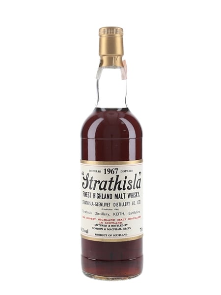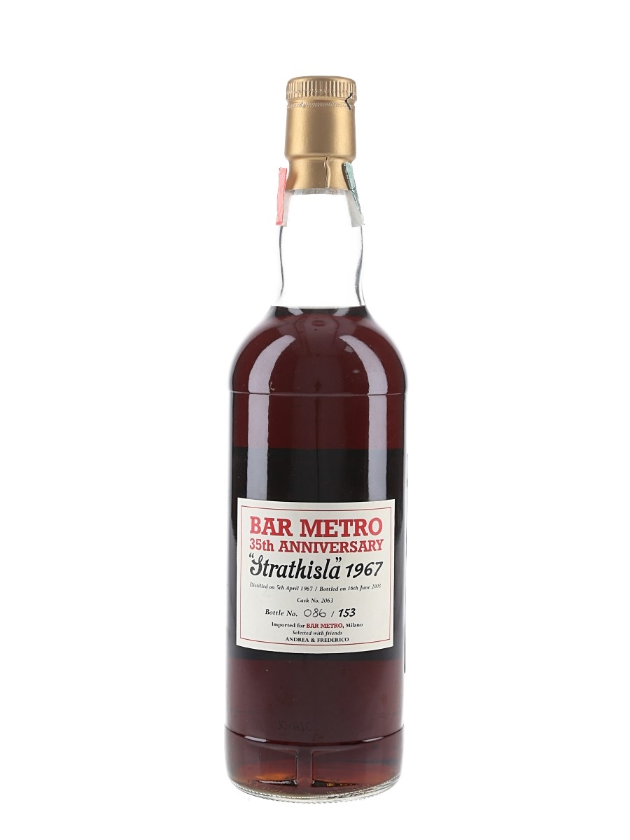 A bottle of Strathisla Speyside Single Malt Scotch Whisky. This was distilled on 5 May 1967, aged in a sherry cask and bottled on 16 June 2003 by Gordon & MacPhail as part to celebrate the 35th Anniversary of Bar Metro, Italy.