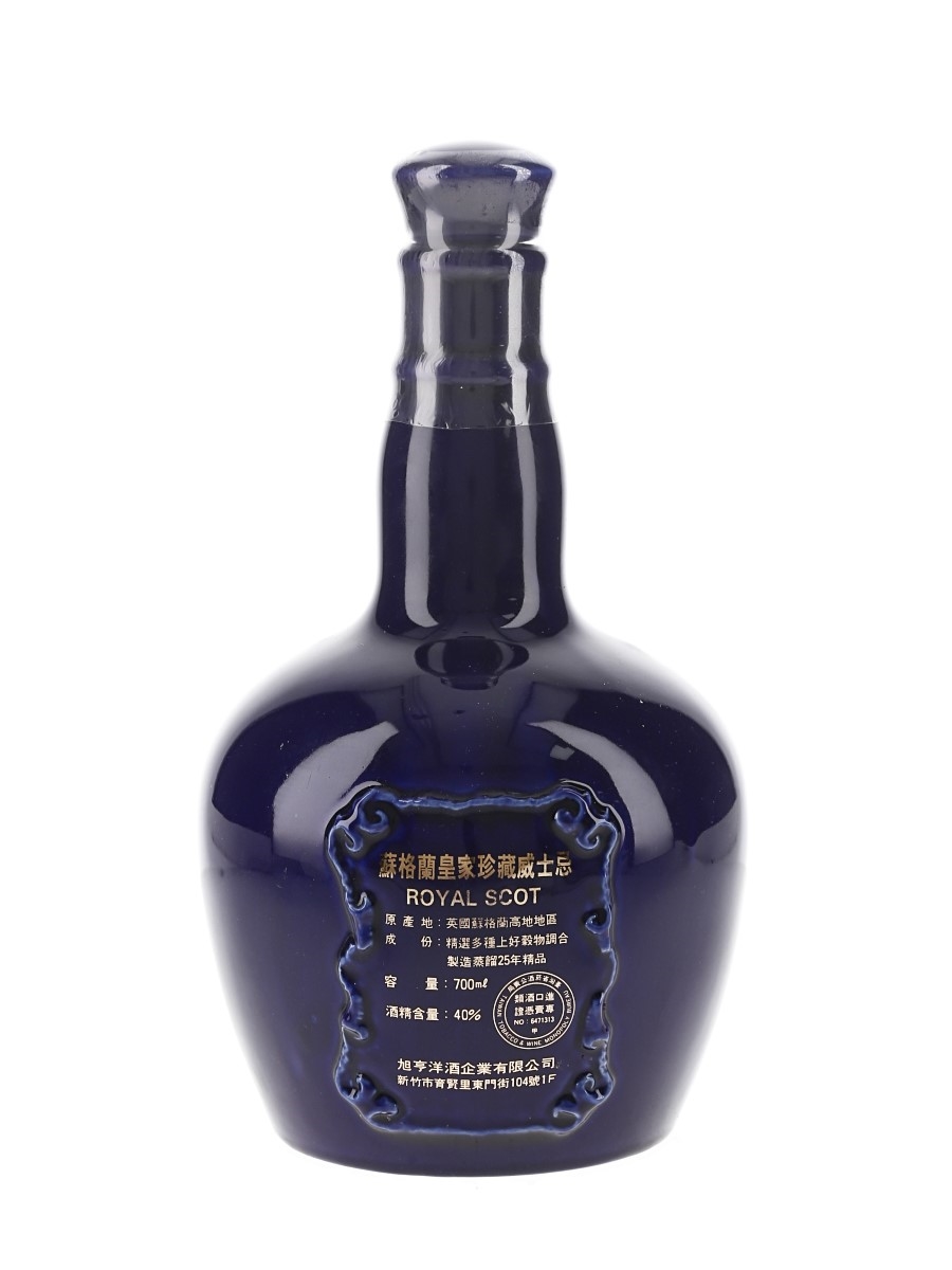 A bottle of Royal Scot 25 Year Old Blended Scotch Whisky, presented in a blue Buchan decanter. This was bottled for the Taiwanese market.