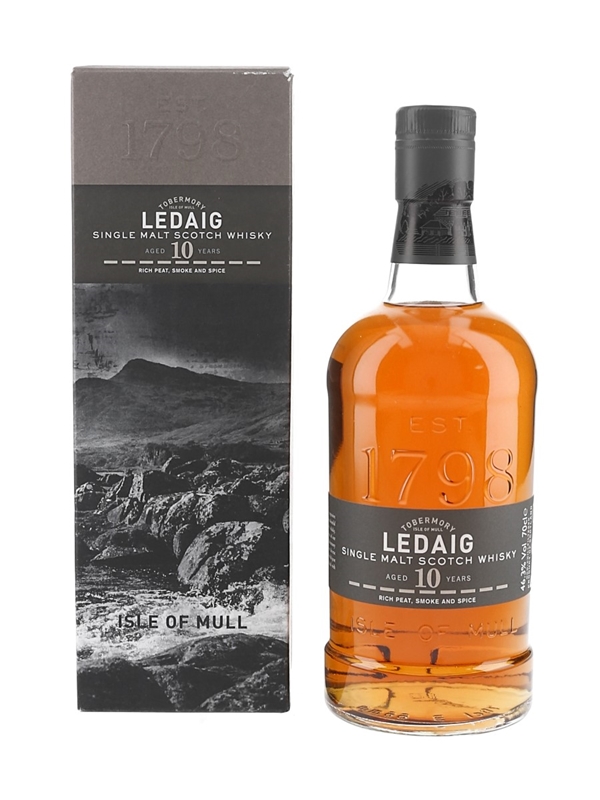 A bottle of Tobermory Ledaig 10 Year Old Single Malt Scotch Whisky.