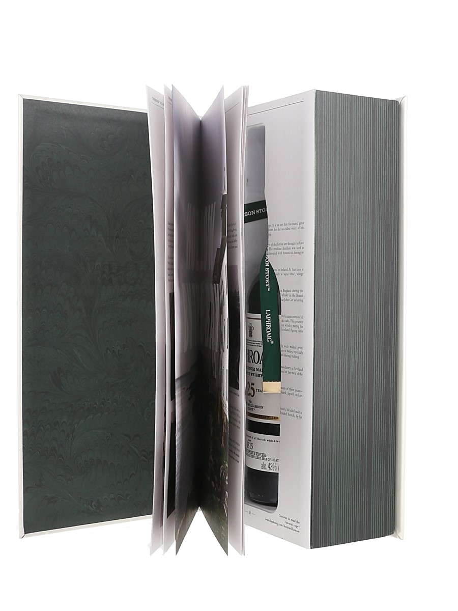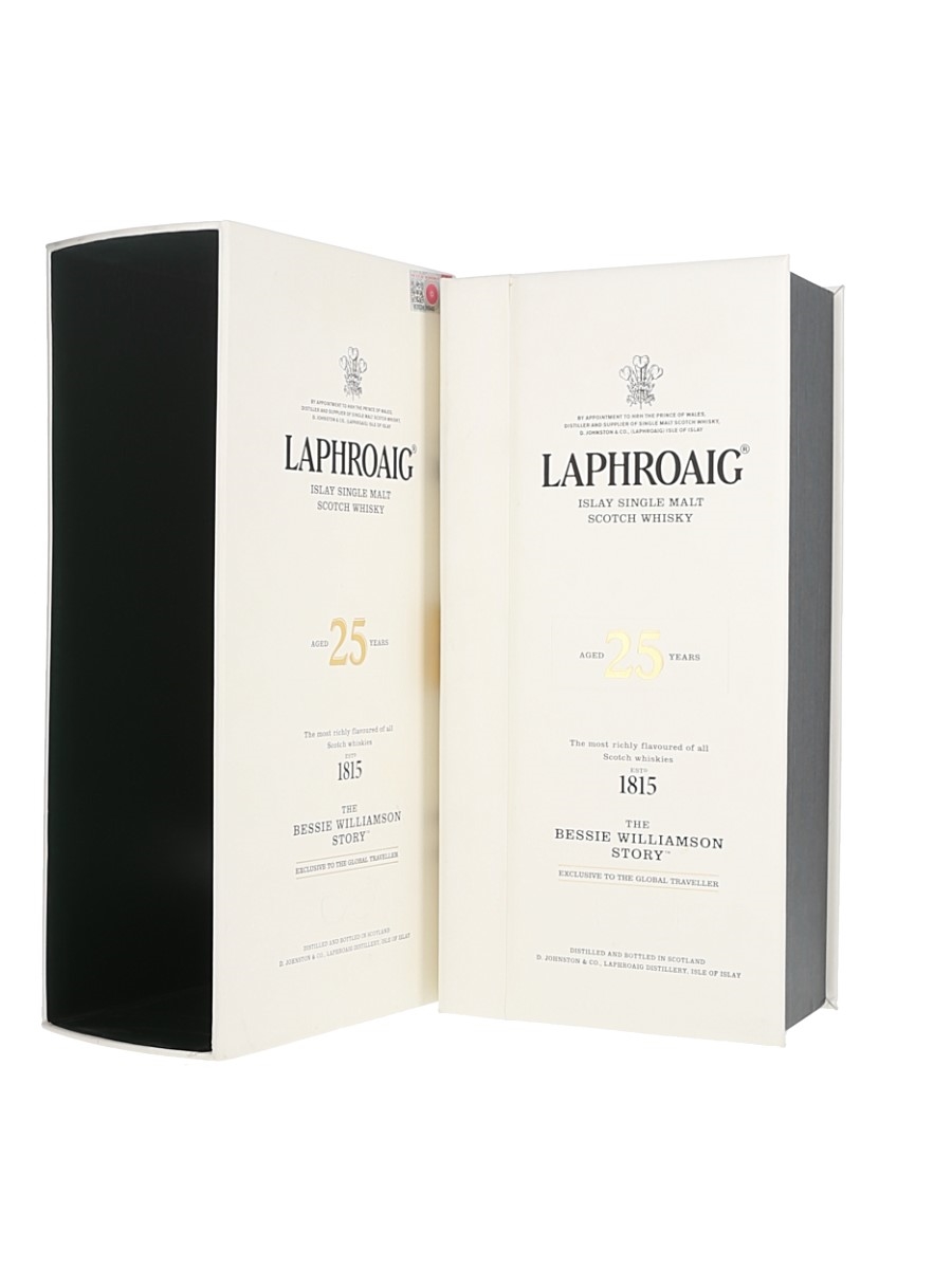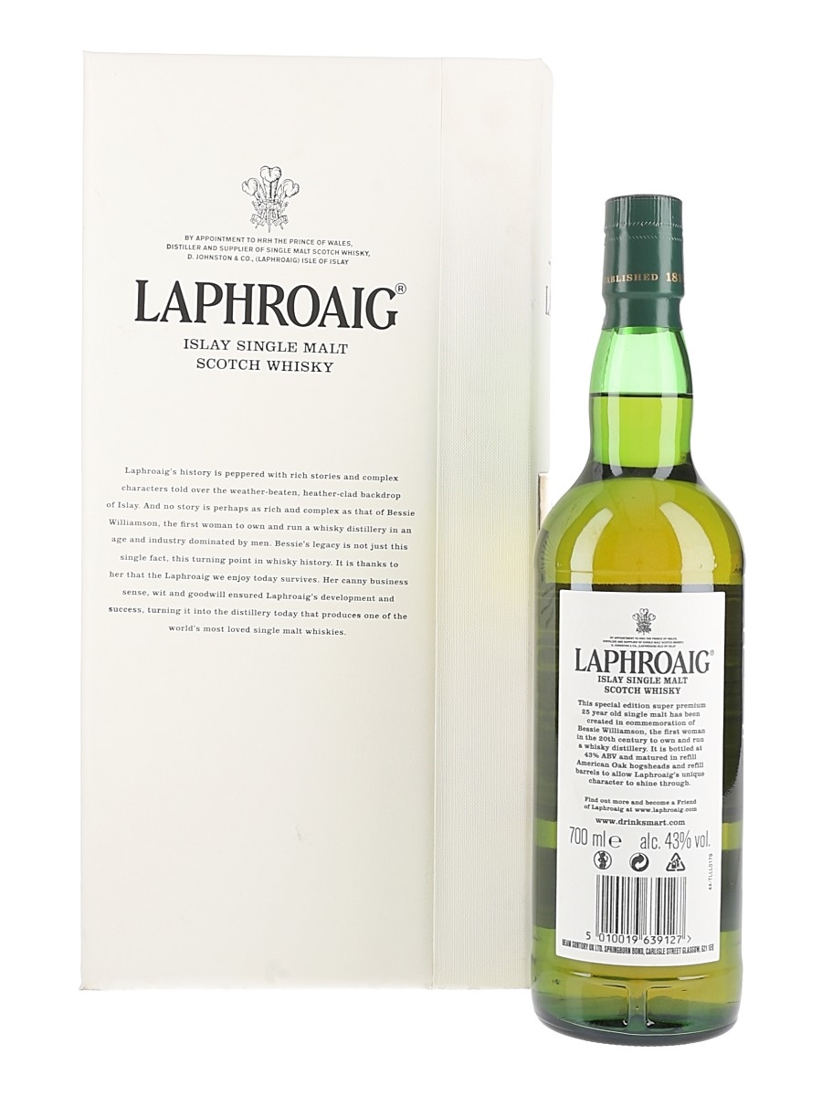 A bottle of Laphroaig 25 Year Old Islay Single Malt Scotch Whisky bottled at 43% ABV. This was released to commemorate Bessie Williamson, the first woman in the 20th century to own and run a whisky distillery, no mean feat in a male-dominated industry. This is a travel retail exclusive.