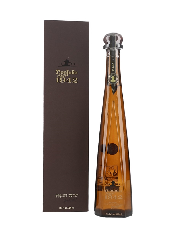 A bottle of Don Julio Tequila Añejo, marking 60 years since Don Julio Gonzalez first started distilling in 1942, aged 17. The liquid was aged for at least two years in oak casks.